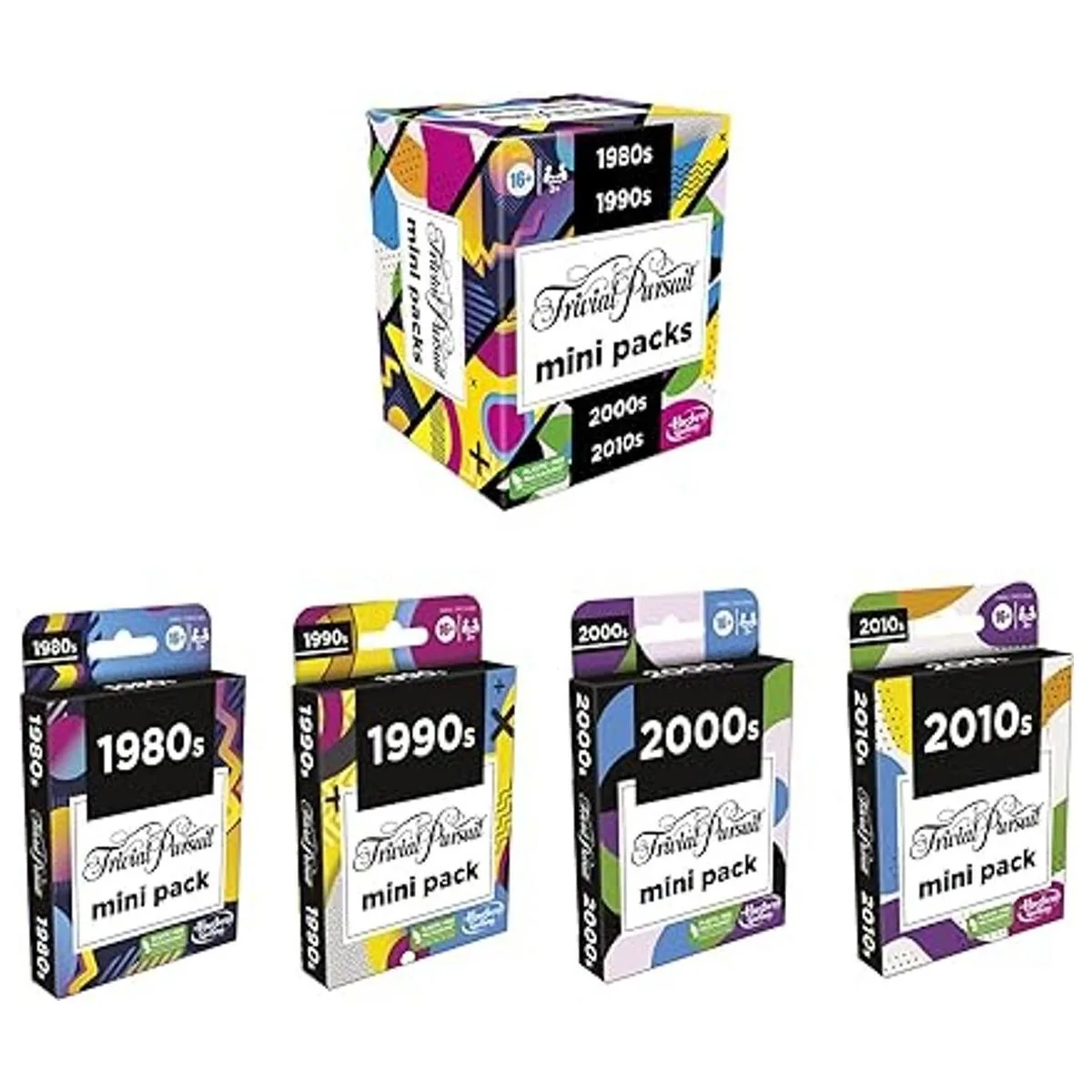 Trivial Pursuit Game Mini Packs Multipack, divertidas preguntas de trivia para adultos y adolescentes a partir de 16 años, incluye 4 paquetes de juego con 4 décadas