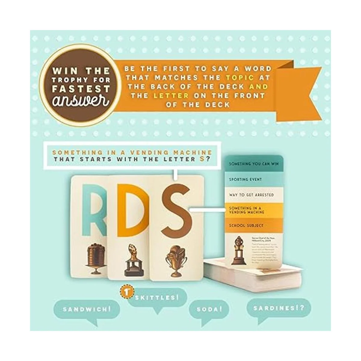 Juego de palabras: en el juego de trofeos, el juez lee un tema y muestra al grupo una letra aleatoria. Gana una tarjeta de trofeo al ser la primera en decir una palabra que coincida con el tema y la letra.