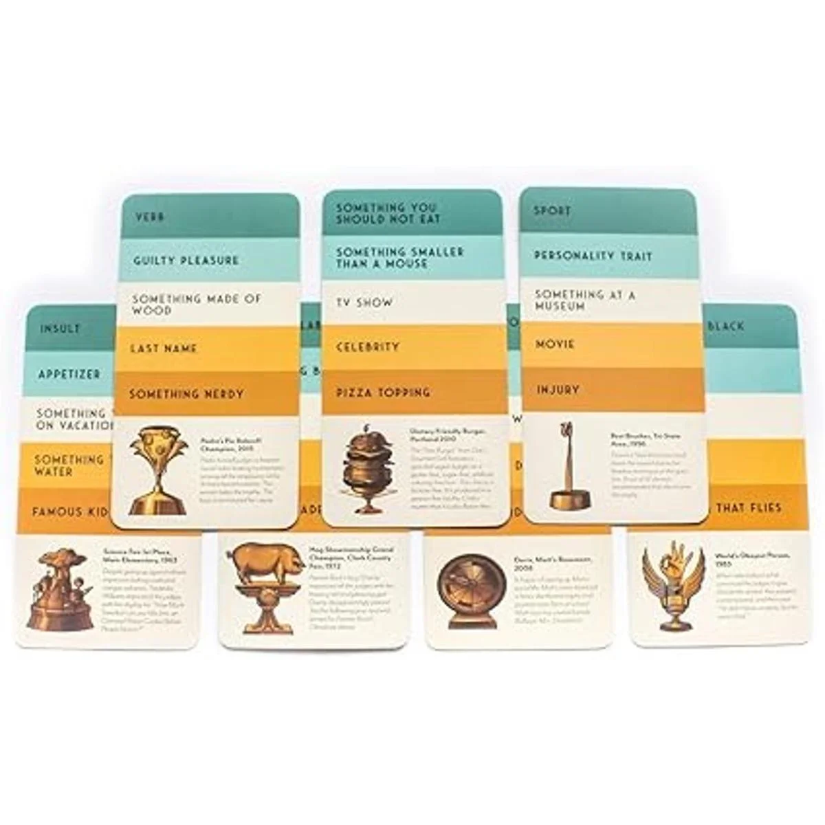 Detalles: juega este juego de 515 minutos de largo con 230 jugadores de 8 años en adelante. Los trofeos incluyen 70 tarjetas de trofeo únicas, 350 temas y un pequeño trofeo de metal para el ganador.