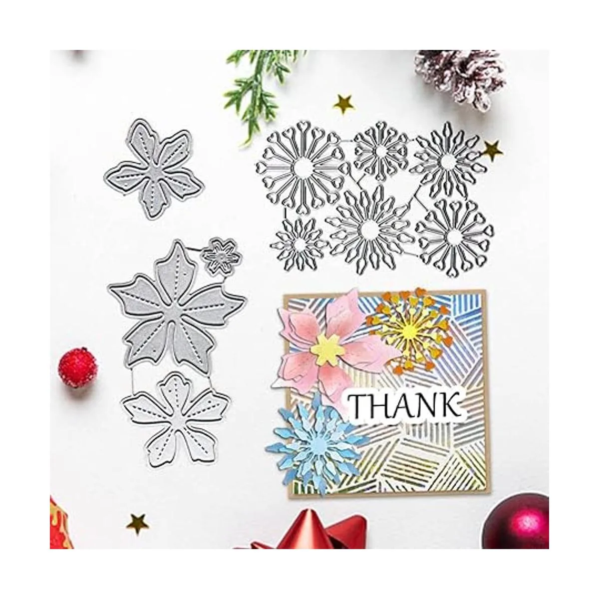 Ampliamente utilizado: Ampliamente utilizado en la vida diaria, troquel de corte de manualidades para todo tipo de tarjetas para álbumes de fotos, álbumes de recortes, tarjetas de papel, etc. Los troqueles de uso pueden crear formas increíbles a partir de tu cartulina favorita y papel, hacer que los diseños de tarjetas y álbumes de recortes sean totalmente únicos, excelentes para recortar fotos con precisión, también son ideales para hacer plantillas o capas para producir un impresionante efecto 3D.