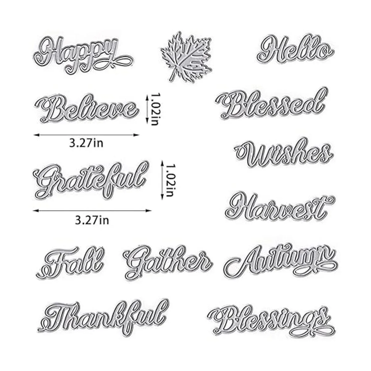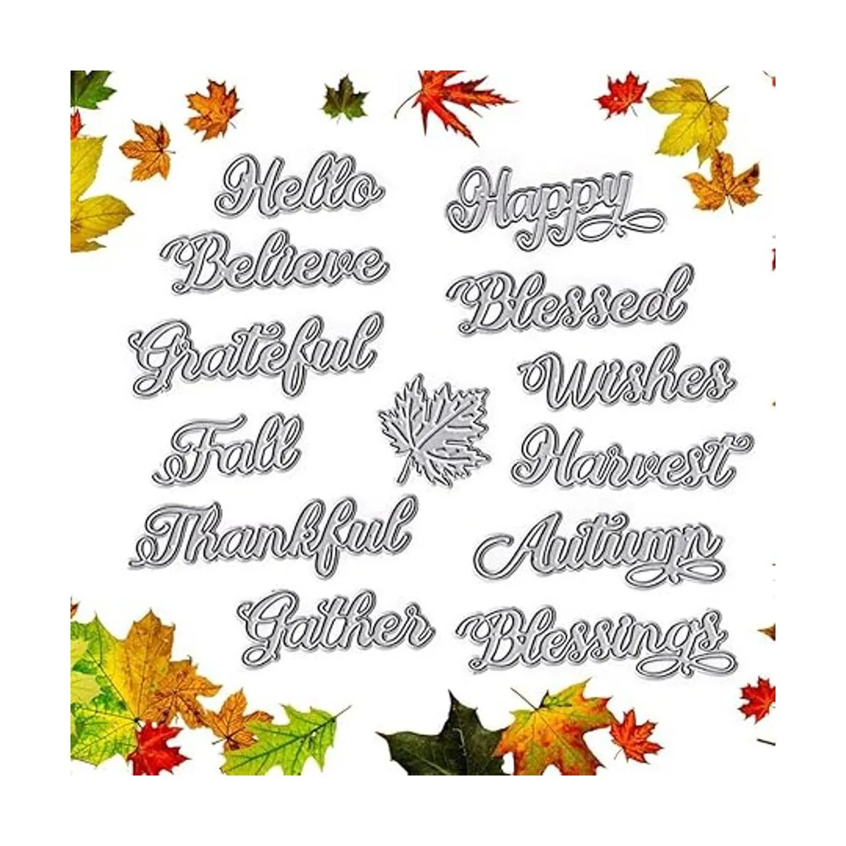Troqueles de corte de palabras de Acción de Gracias de otoño para hacer tarjetas y decoraciones de álbumes de fotos, letras agradecidas de otoño, plantillas de troqueles de hojas de otoño, plantillas de relieve para manualidades de álbumes de recortes