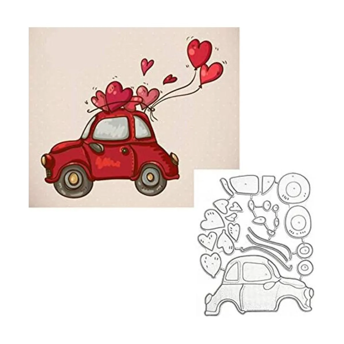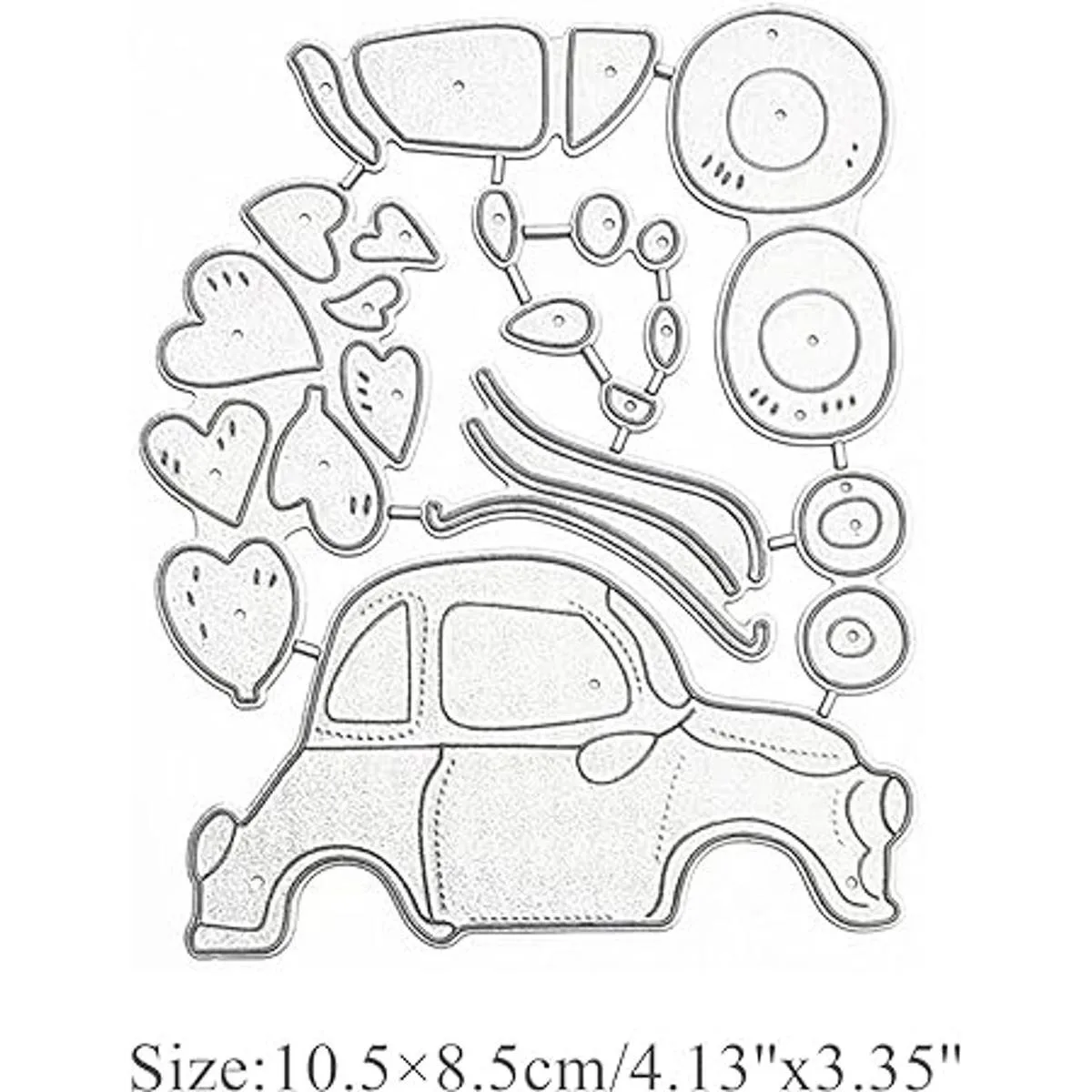 Color y tamaño: Color: plateado. Tamaño: 4.13 x 3.35 pulgadas. El paquete incluye: el juego de troqueles de corte contiene 1 unidad/juego de plantillas de metal con patrón de coche y corazones.
