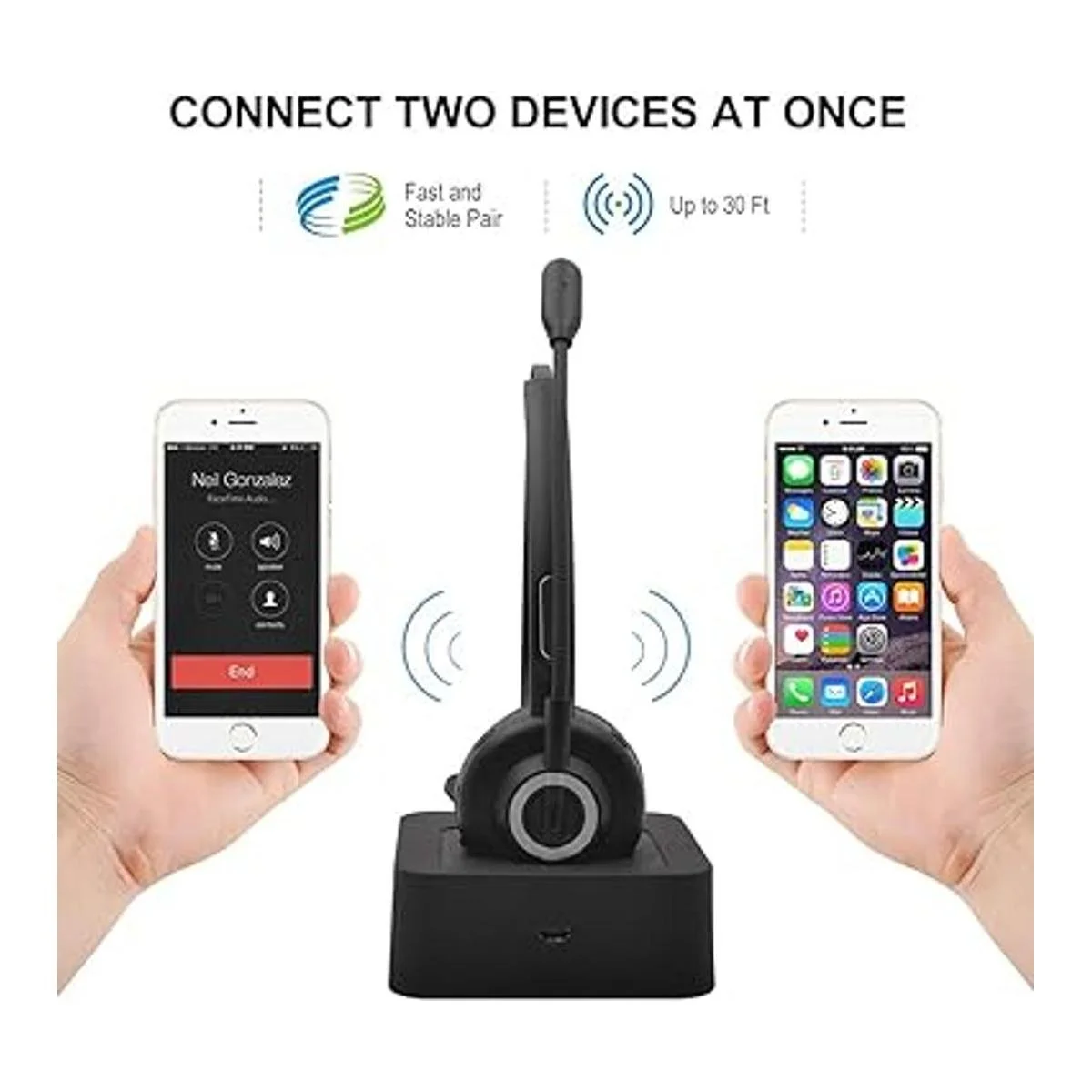 Batería de larga duración: los auriculares Bluetooth pueden ofrecer hasta 16 horas de tiempo de conversación continua y 180 horas de tiempo en espera con una sola carga completa en solo 2 horas; se carga fácilmente, simplemente ponlo en la elegante base de carga con un micro USB, lo que significa que puedes concentrarte en tu trabajo.