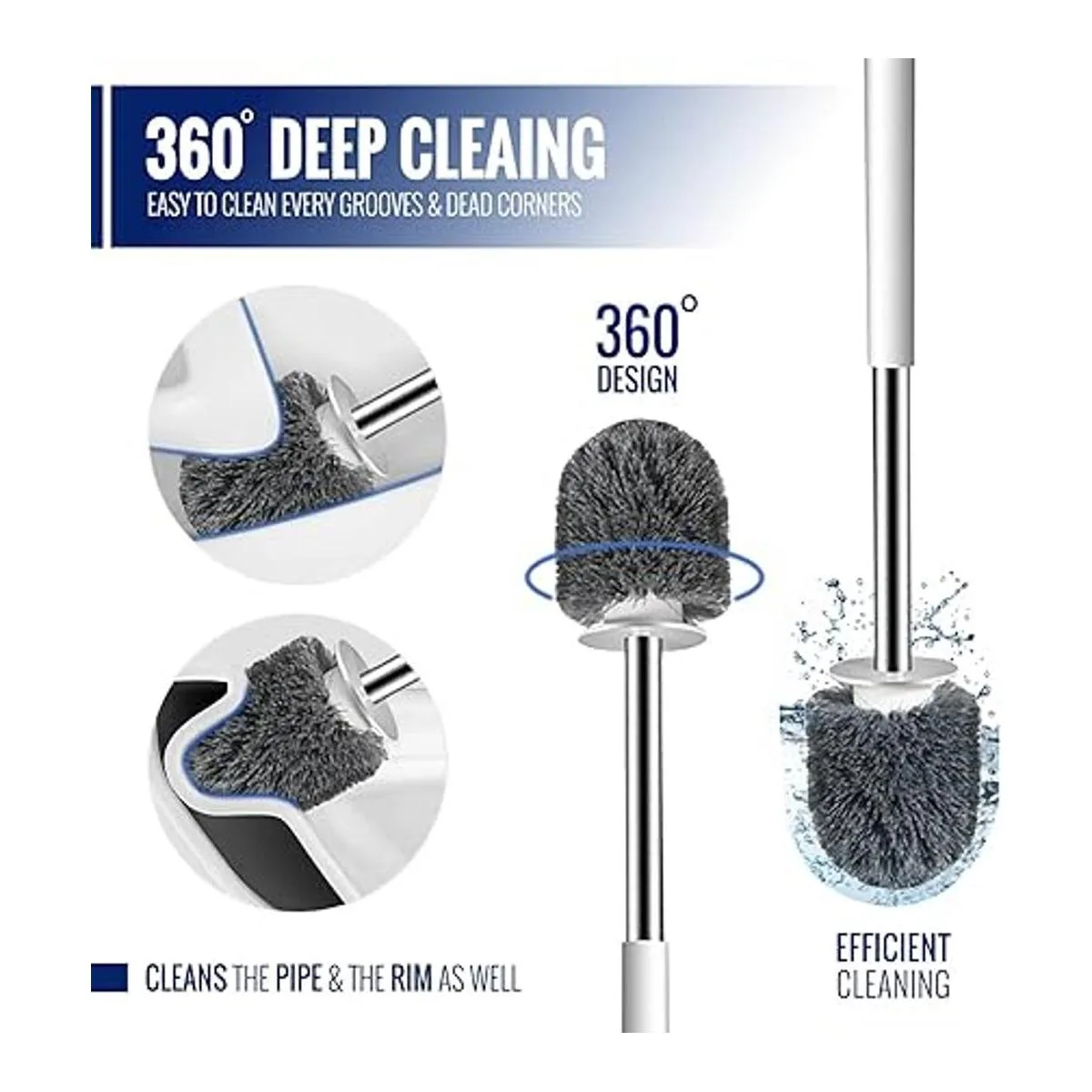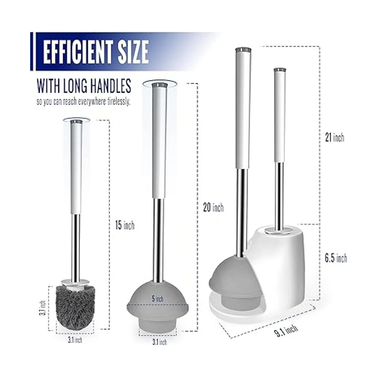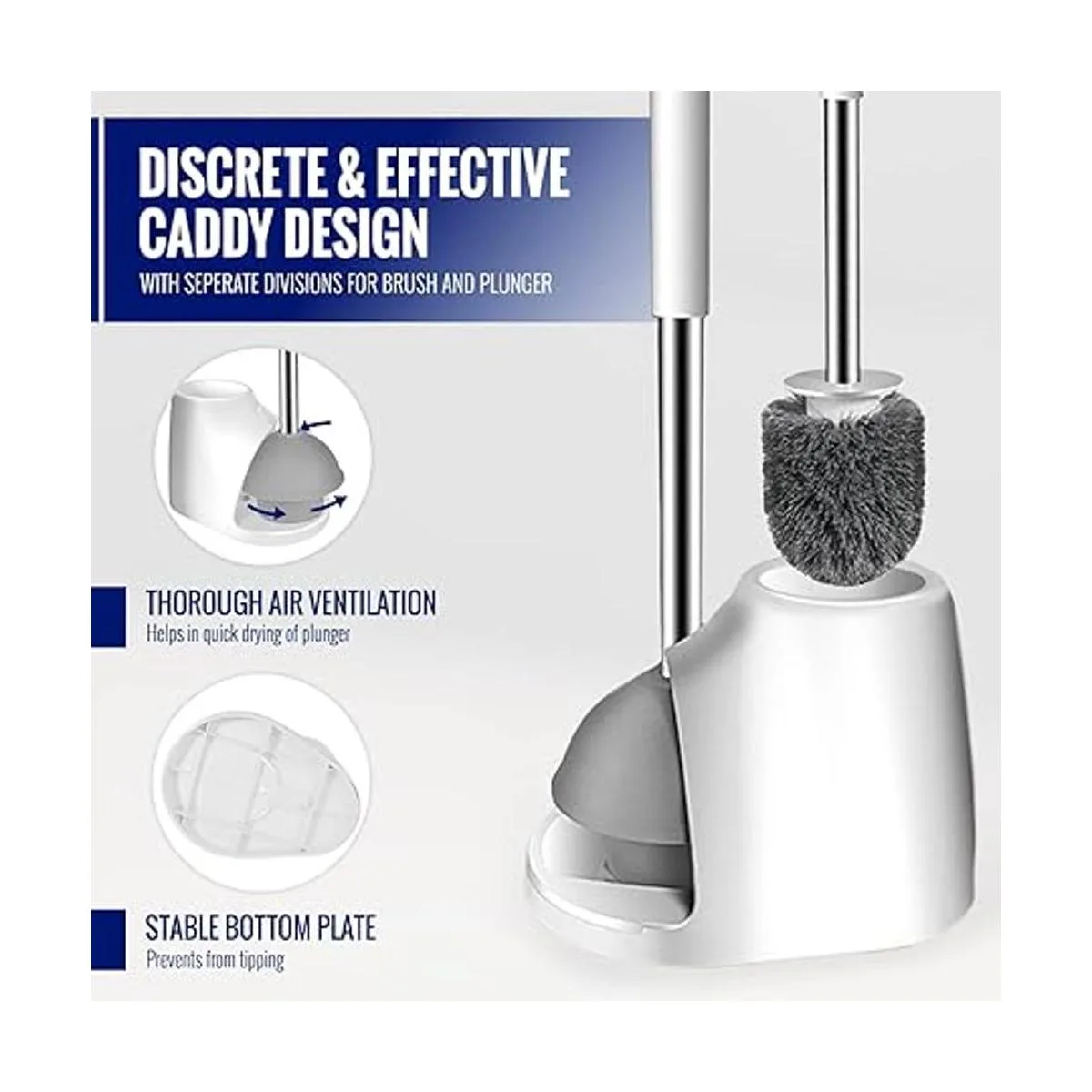 Diseño compacto 2 en 1: el paquete contiene 1 émbolo de varilla de acero inoxidable, 1 cepillo de cerdas de varilla de acero inoxidable para limpiar y frotar el inodoro del baño y 1 pinza oculta dentro del mango del cepillo. Todo el juego viene con un organizador de base antidrapeado, tiene capacidad de almacenamiento de agua que mantiene el suelo seco todo el tiempo con sistema de ventilación para secar el cepillo más rápido después del uso.