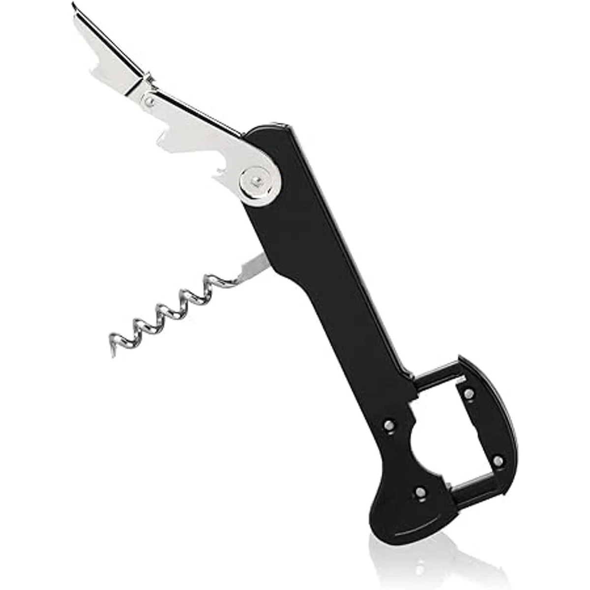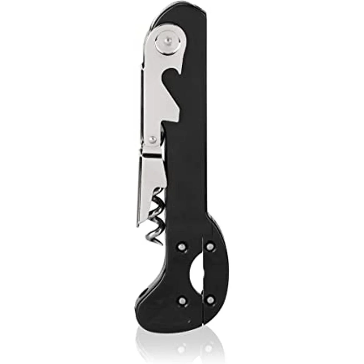 La llave de vino perfecta: donde la forma se une a la función. Este sacacorchos de camarero de doble bisagra tiene un abridor de botellas, cortador de papel de aluminio extensible fácil de usar, gusano de acero inoxidable de 5 vueltas y acabado negro. Añade esta llave de vino a tu carrito de bar para descorchar sin esfuerzo.