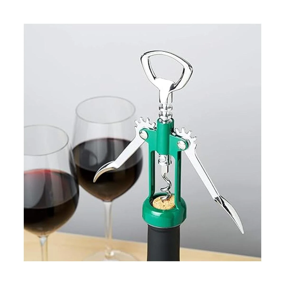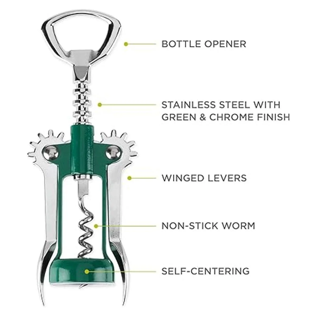 Colorido acabado verde: un acabado verde y plateado y el clásico diseño de sacacorchos con alas combina función y estética para el último accesorio de bar en casa. Añade algo de estilo a tu carrito de bar y haz que tu próxima fiesta de degustación de vino sea extra elegante.
