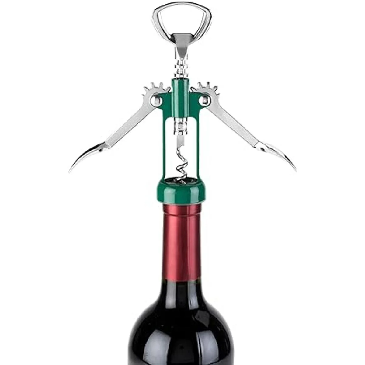 Abridor de botellas de vino con viento: este sacacorchos verde y plateado con gusano autocentrado y abridor de botellas integrado hace que el servicio de vino sea muy fácil. Nunca más luches con llaves de vino poco manejables. Perfecto para cenas o cócteles