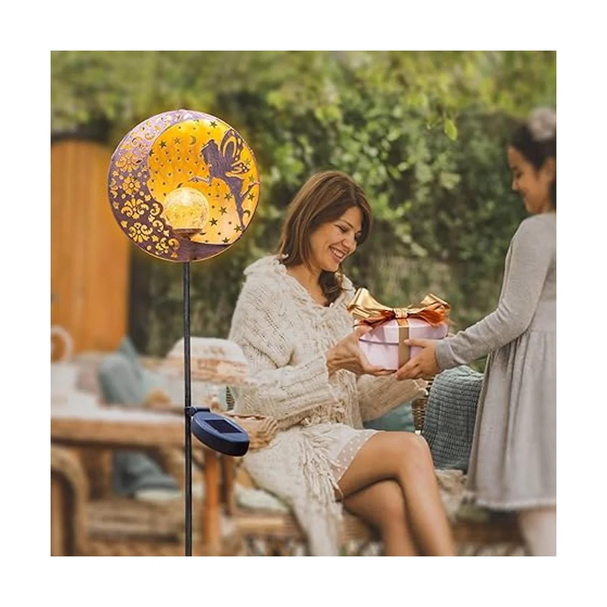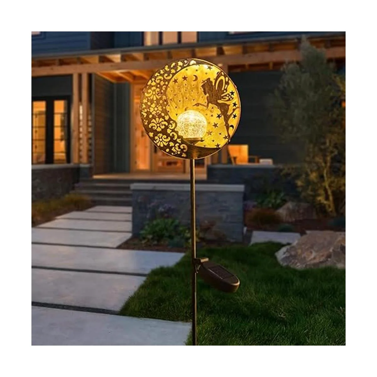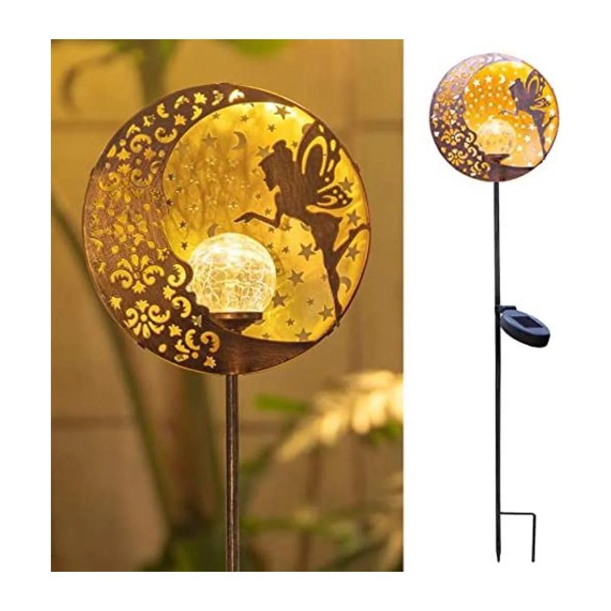 Tryme Luces solares de jardín, hadas, lunas, estrellas, globo de cristal, estaca, decoración de ángel de metal, luces decorativas al aire libre, impermeables, para pasarelas, patios, césped, patio o patio blanco cálido