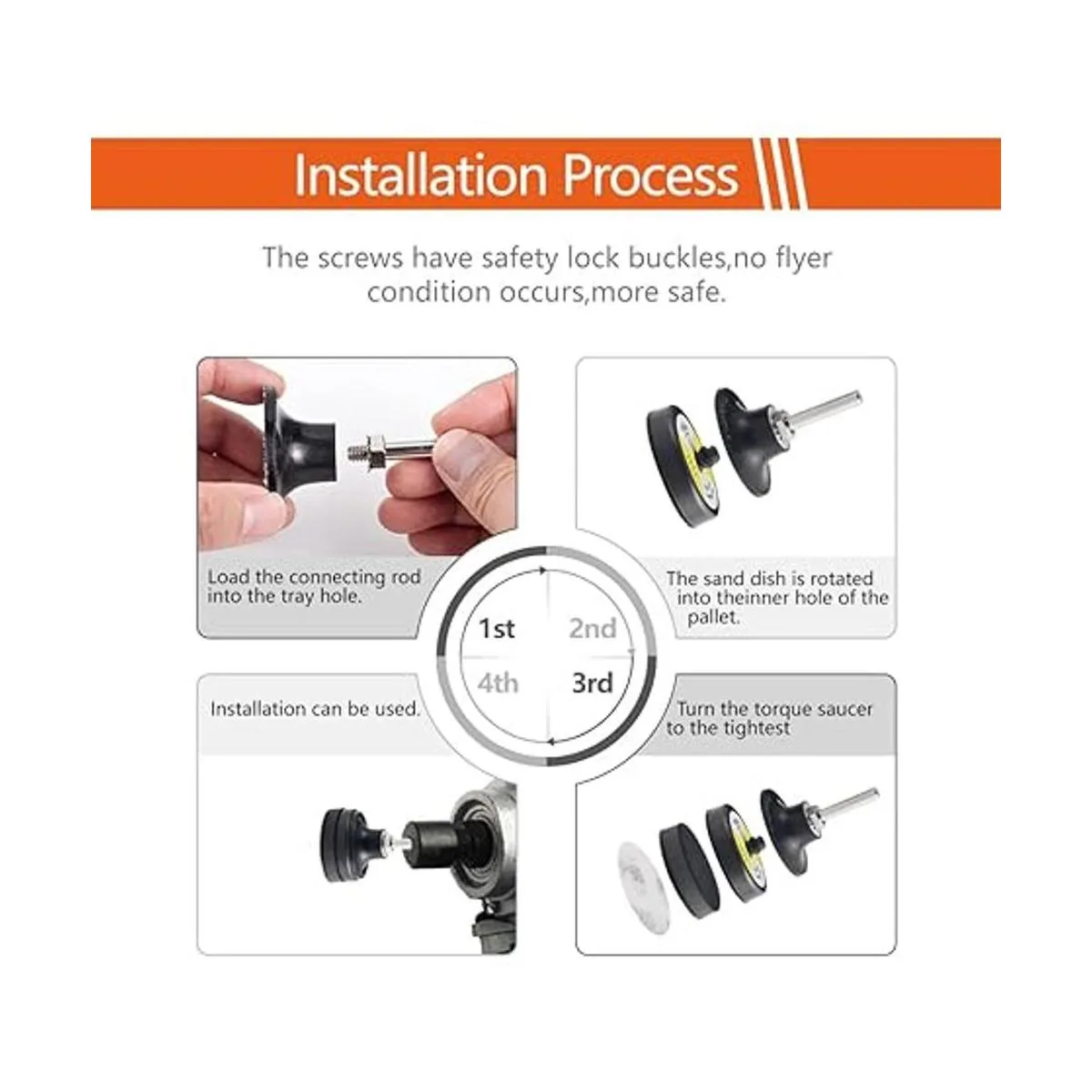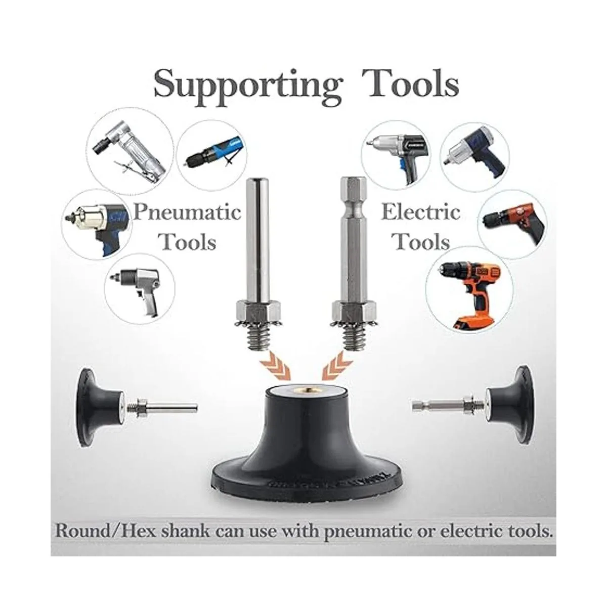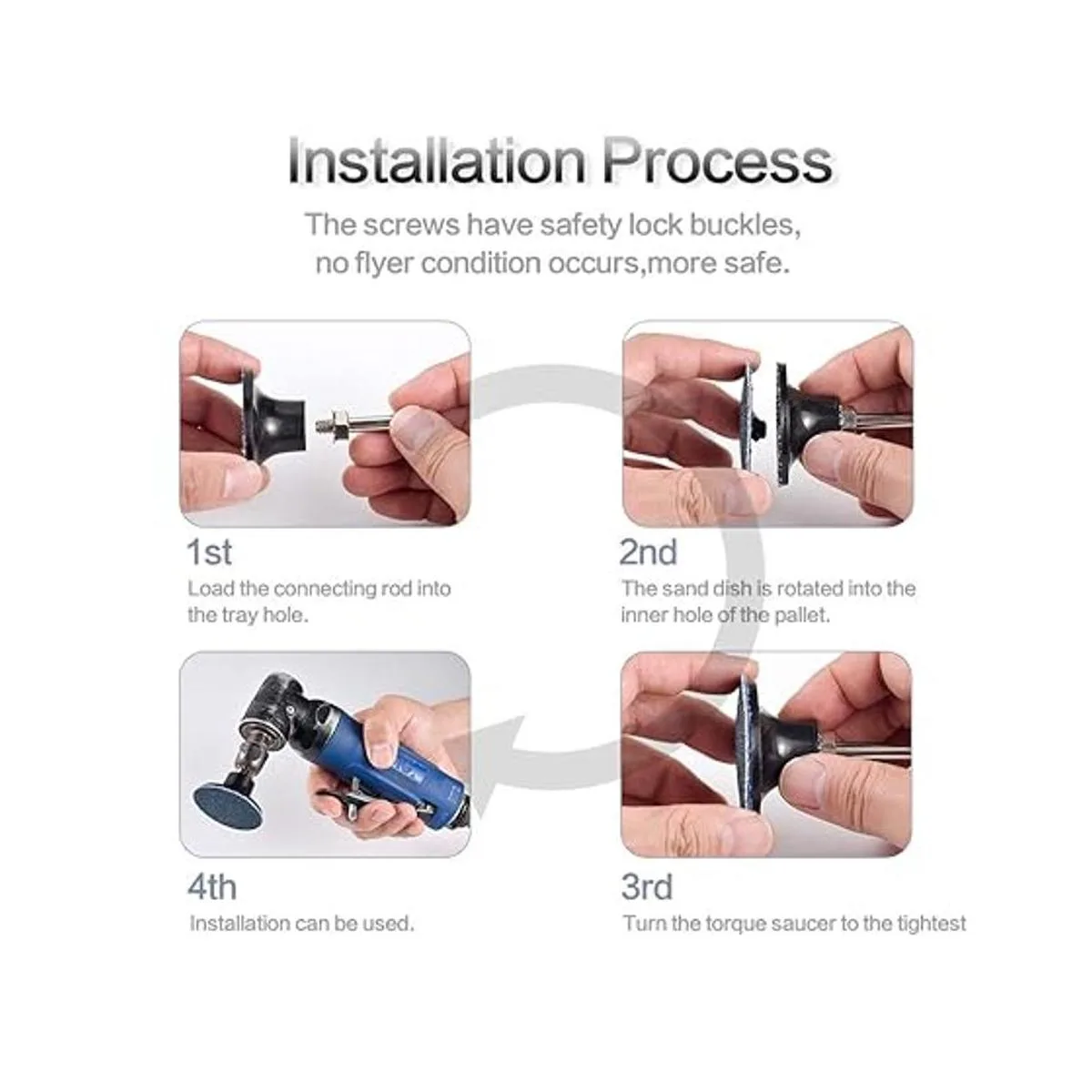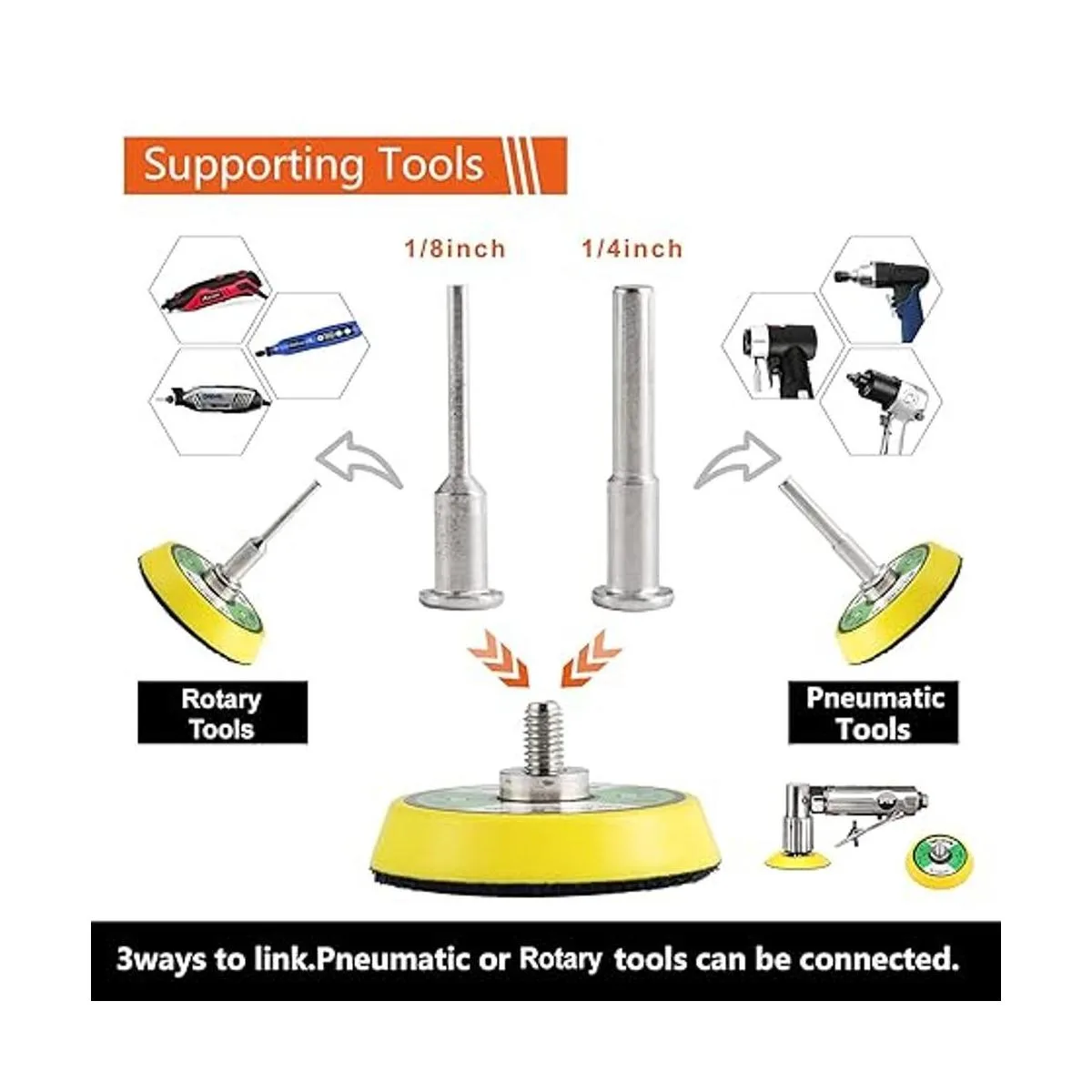 Conexión de tres maneras: la placa trasera de herramientas de aire con vástago de 1/8 pulgadas y 1/4 pulgadas puede funcionar con cualquier taladro de aire o eléctrico, amoladora de troquel y otras herramientas giratorias para el máximo control de lijado. Incluso puedes poner la almohadilla directamente en una herramienta neumática sin vástago.