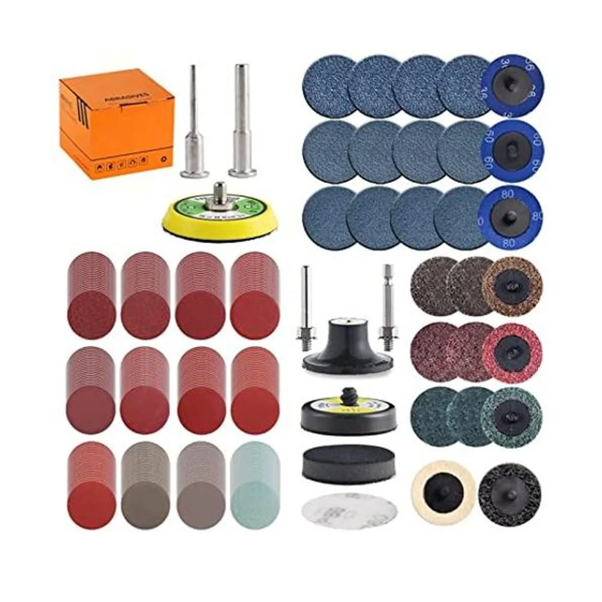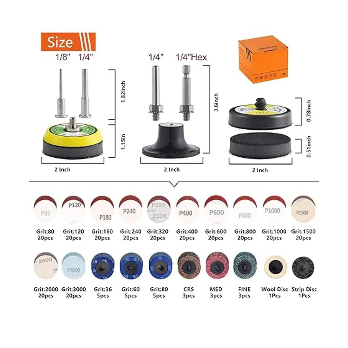 Paquete de 270 240 discos de lijado HL de 2 pulgadas P80/120/180/240/320/400/600/800/1000/1500/2000/3000 cada 20 unidades, 15 discos de bloqueo de rollo de circonita P360000 60 60 60 /80 cada uno 5 piezas, 9 discos no tejidos, 1 disco de tira, 1 disco de lana, 1 placa trasera de herramientas de aire con vástago de 1/8 pulgadas y 1/4 pulgadas, 1 almohadilla de disco con vástagos redondos/hexagonales de 1/4 pulgadas, 1 almohadilla amortiguadora de capa de espuma suave, 1 almohadilla adaptador de espuma de poliuretano.