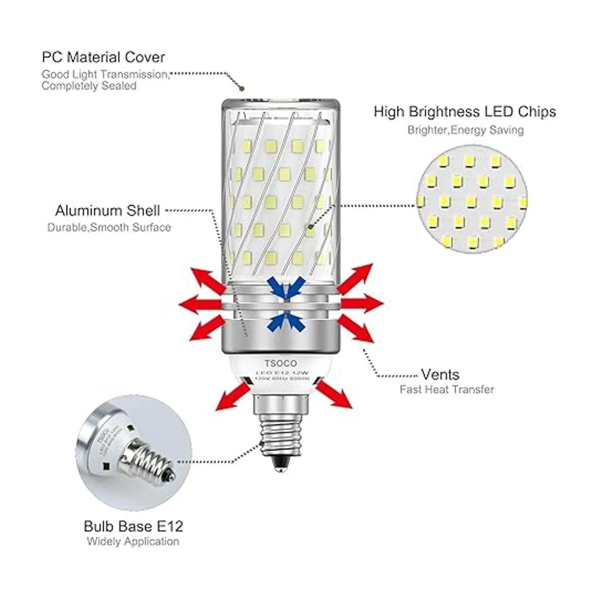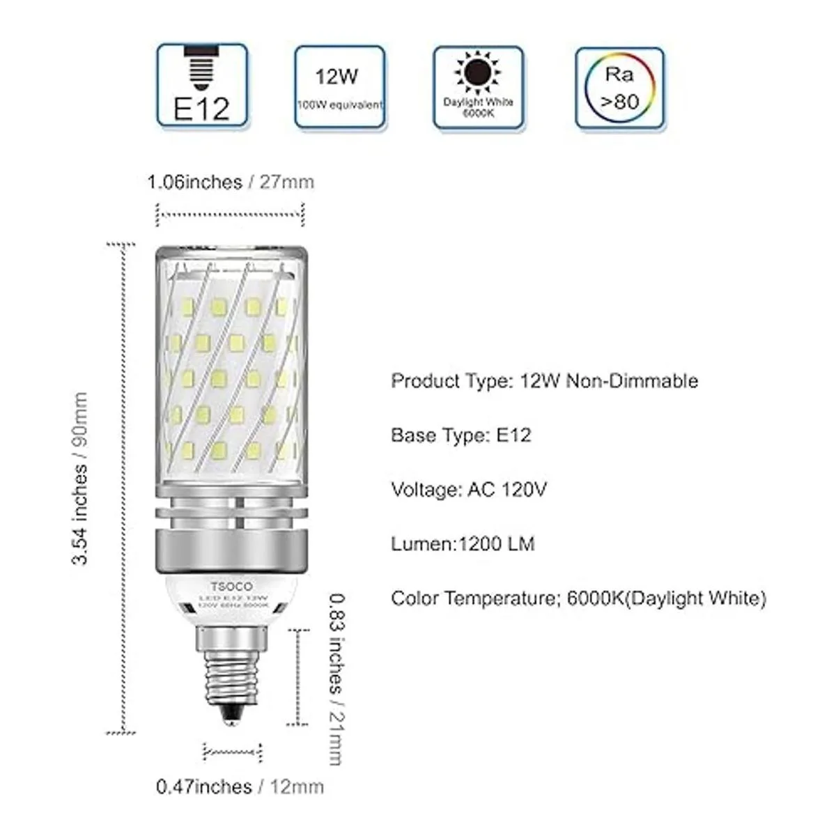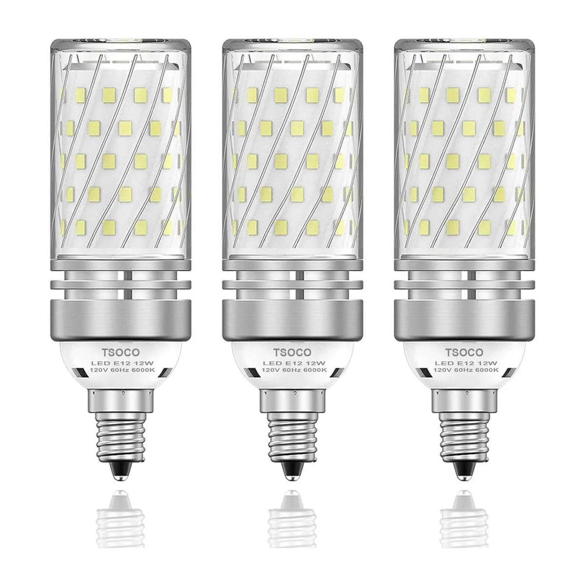 TSOCO Bombillas LED E12, bombillas LED de araña de 12 W, equivalente a 100 vatios, luz blanca diurna de 6000 K, 1200 lúmenes, bombillas de ventilador de techo no regulables, paquete de 3 luz de día 12 W