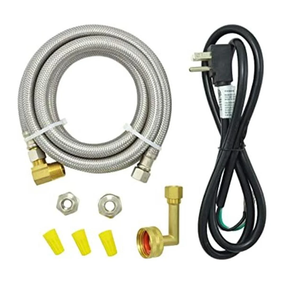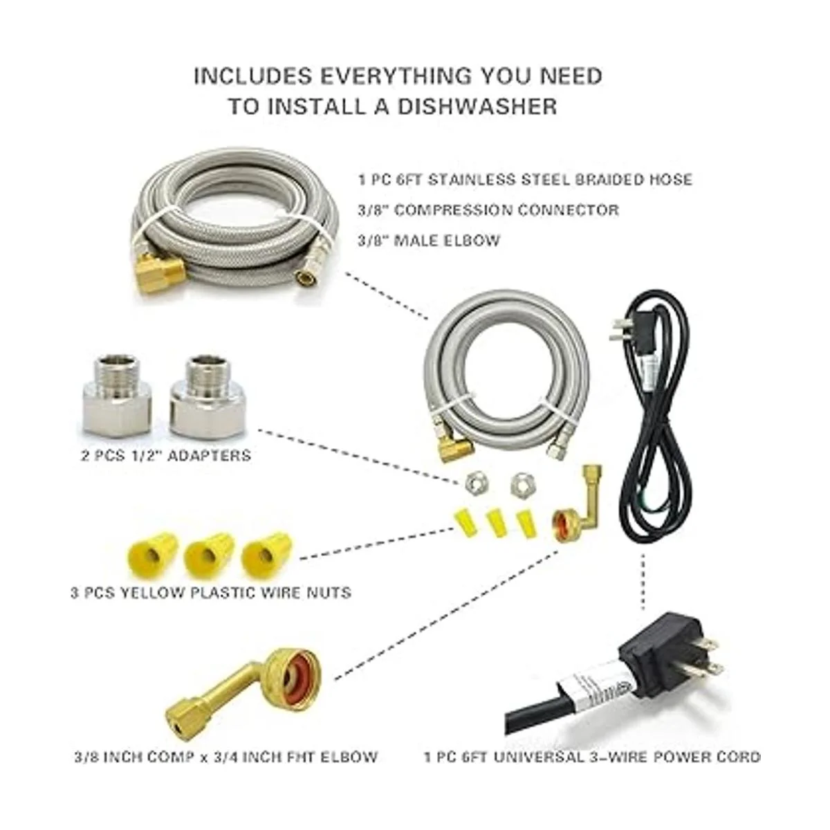 Kit completo de instalación: nuestro kit universal de instalación de lavavajillas incluye 1 línea de suministro de lavavajillas de acero inoxidable de 6 pies con conexiones Comp de 3/8 pulgadas x 3/8 pulgadas, 1 adaptador de conector de codo MIP de 3/8 pulgadas, 1 codo FHT de 3/8 pulgadas, 3 tuercas de alambre de plástico amarillo, 2 adaptadores de 1/2 pulgada y 1 cable de alimentación universal de 3 cables.