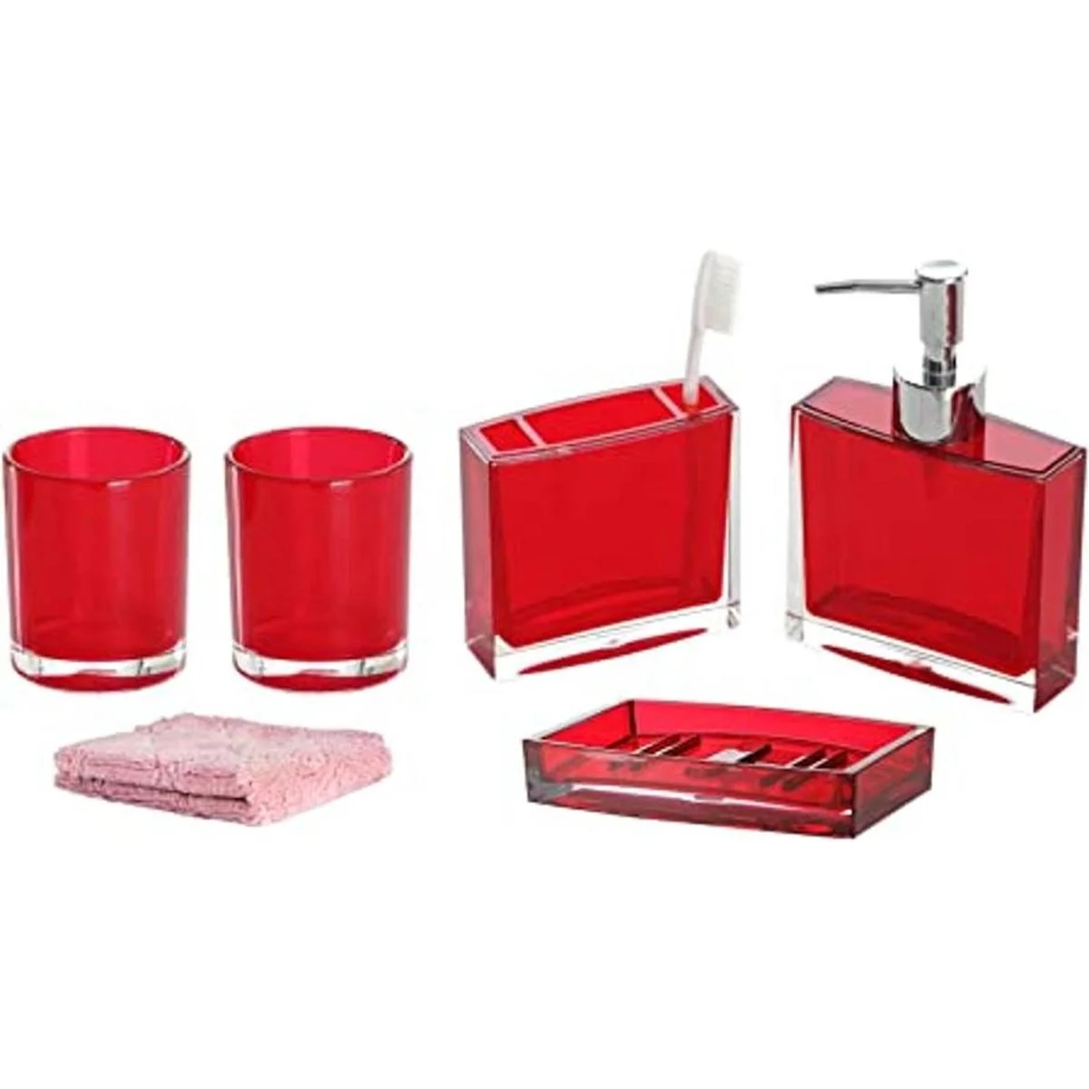 TUANYO Juego de accesorios de baño rojos, juego de 6 accesorios de baño acrílicos, soporte para cepillos de dientes, 2 vasos para cepillos de dientes, dispensador de jabón, jabonera y paño de limpieza para baño rojo