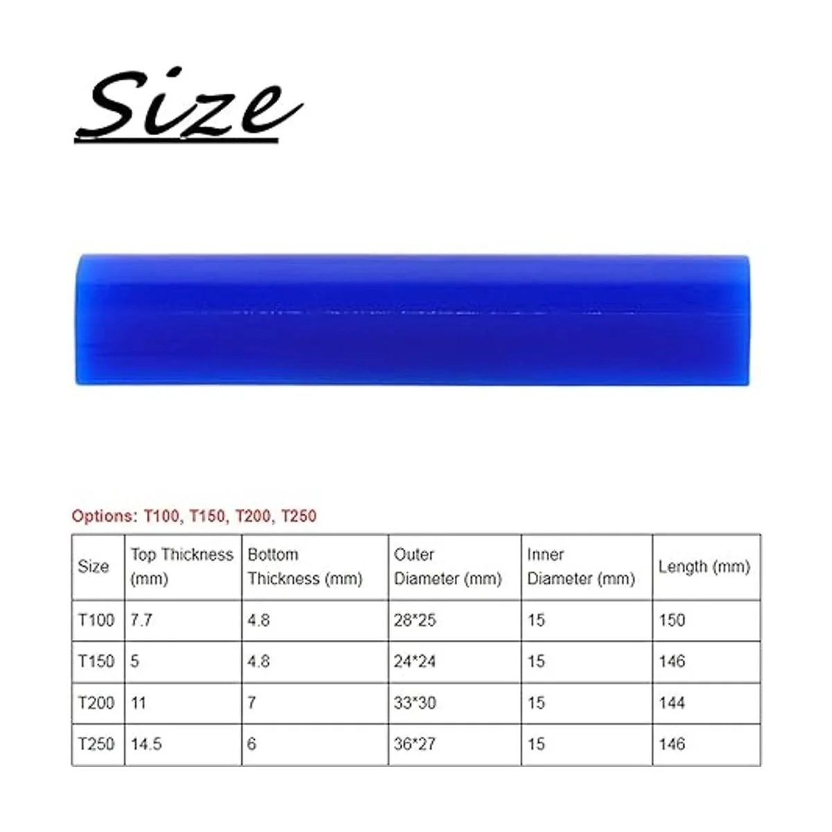 Las dimensiones seleccionadas son diferentes: opciones: T100, T150, T200, T250; Dimensiones Espesor superior mm Grosor inferior mm Diámetro exterior mm Diámetro interior mm Longitud mm T100: 7.7 4.8 28 x 2515 150, T150: 11 4.8 24 x 24 1 1 5 146 5 , T200: 5 7 33 30 15 144, T250: 14.5 6 36 27 15 146