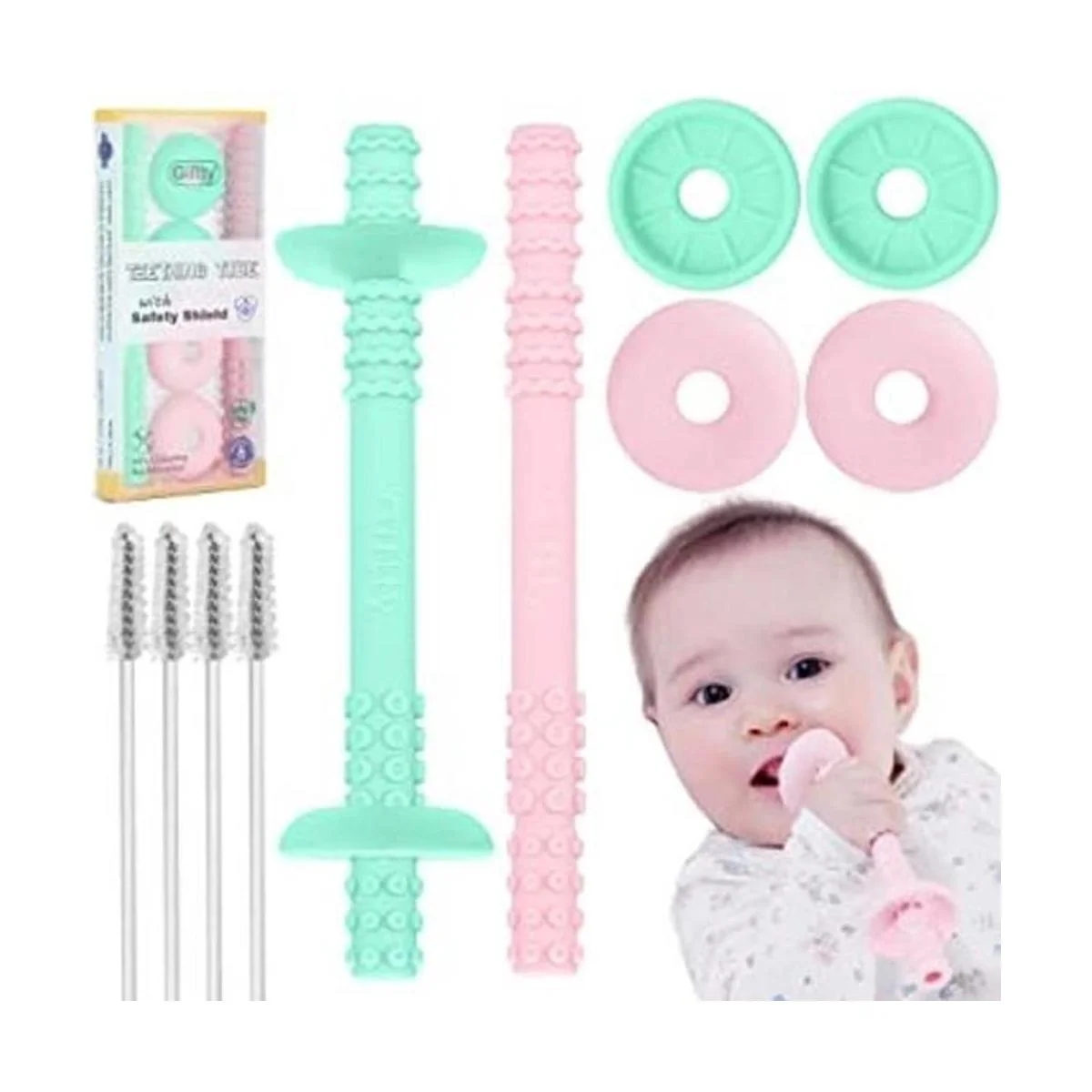 Tubo de dentición con escudo de seguridad Baby Hollow Teether Sensory Toys Masajeador de encías, silicona de grado alimenticio para bebés de 3 a 12 meses niños niñas, 1 par con 4 cepillos de limpieza incluidos (rosa+menta)
