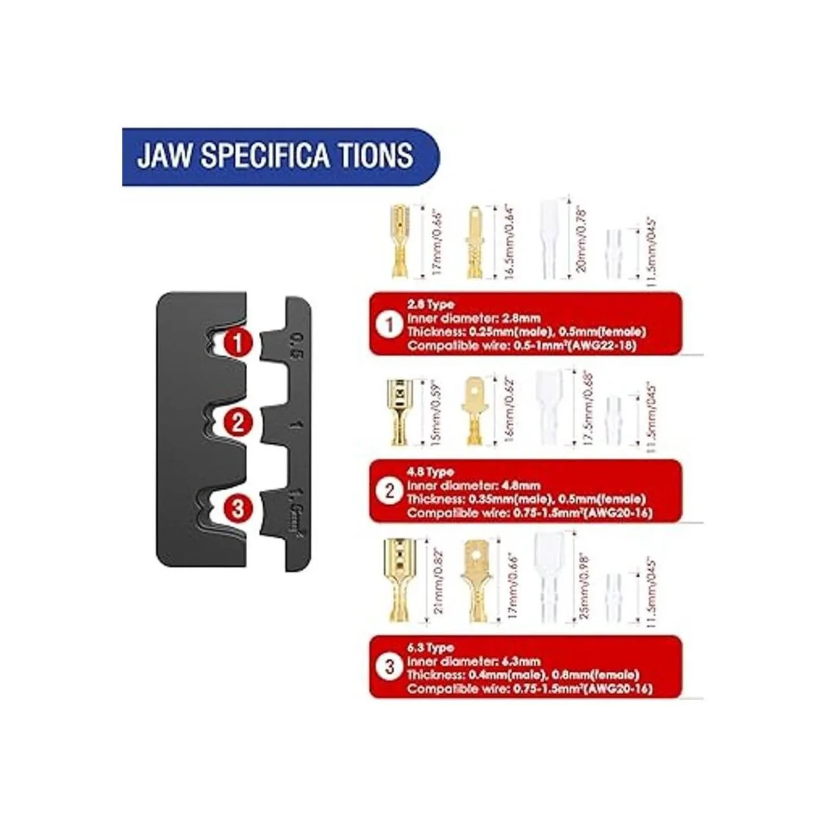 Herramienta de crimpado profesional: el rango de crimpado de la herramienta de crimpado es AWG 2216, 0,51,5 mm, adecuado para conectores de pala TAB de 0.110 in, 0.189 in, 0.248 in y conectores de bala de 0.138 in, 0.157 in.