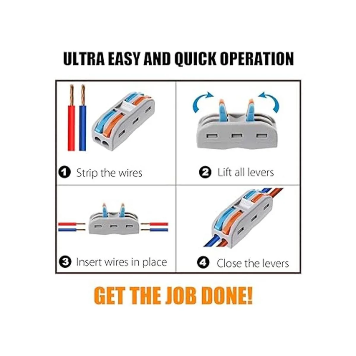 Fácil operación: levanta los conectores, inserta los cables pelados en su lugar, simplemente cierra los conectores. Haz el trabajo