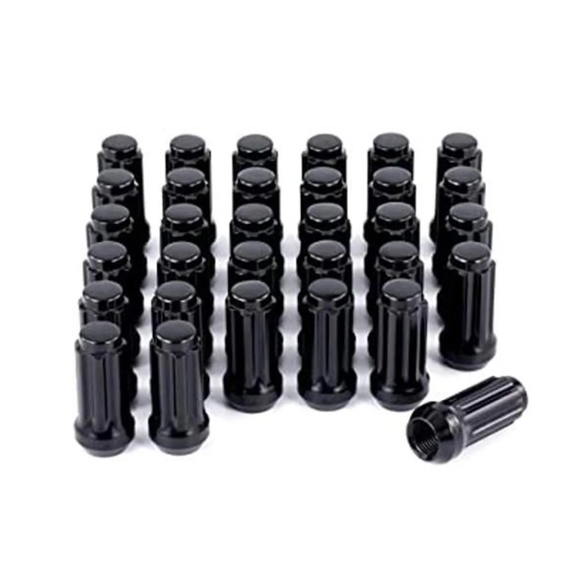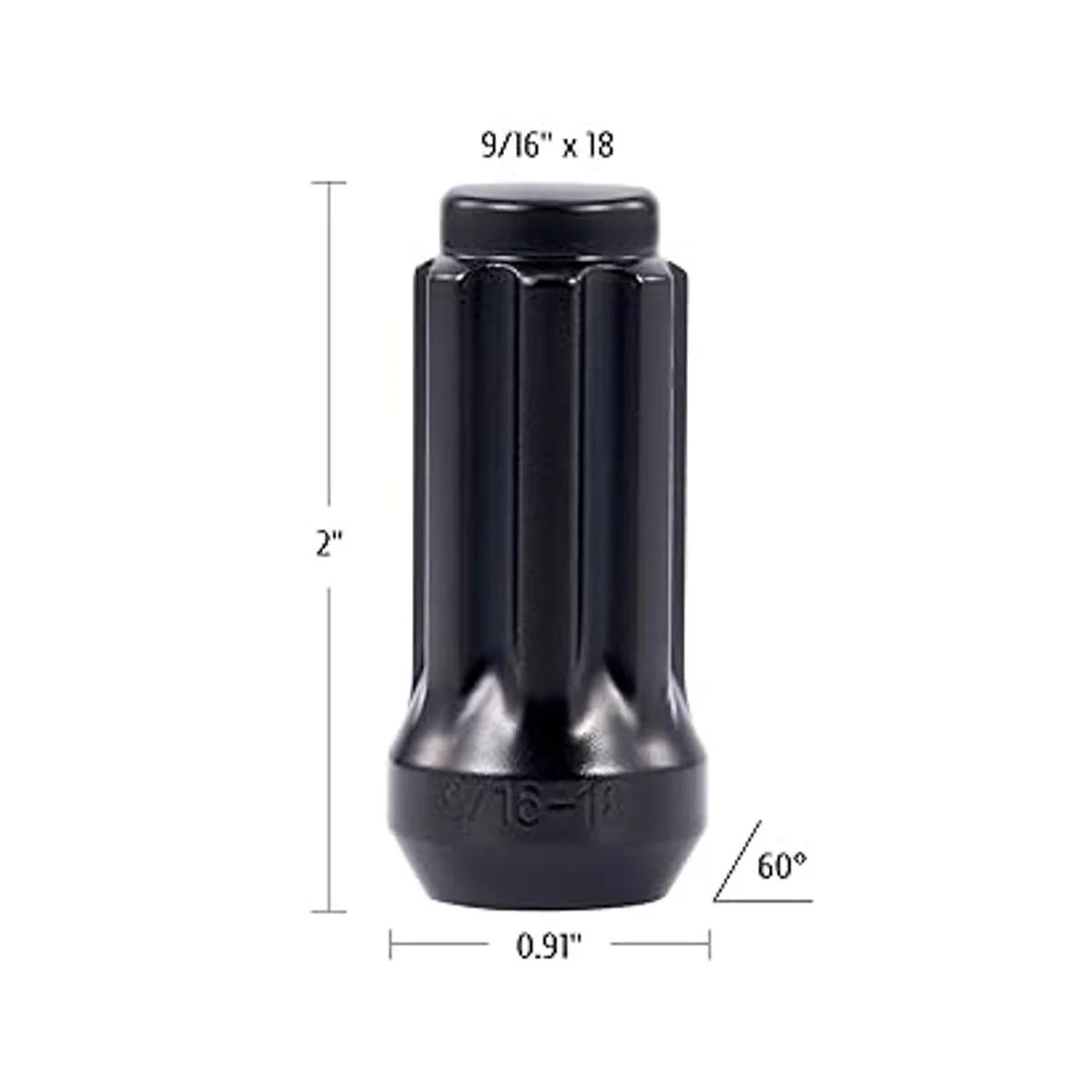 32 tuercas negras, paso de rosca 9/1618, alto total 1.969 in, ancho 0.906 in, asiento cónico de 60 grados, extremo cerrado, accionamiento estriado, llave de enchufe para instalación de 0.827 in y 0.866 in hexagonal