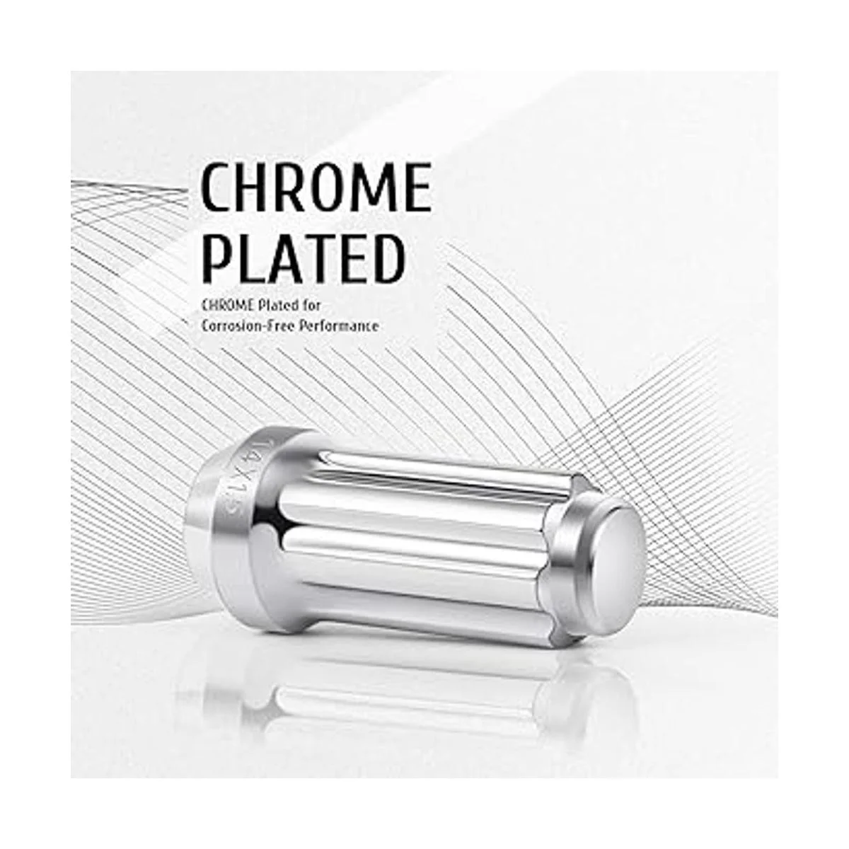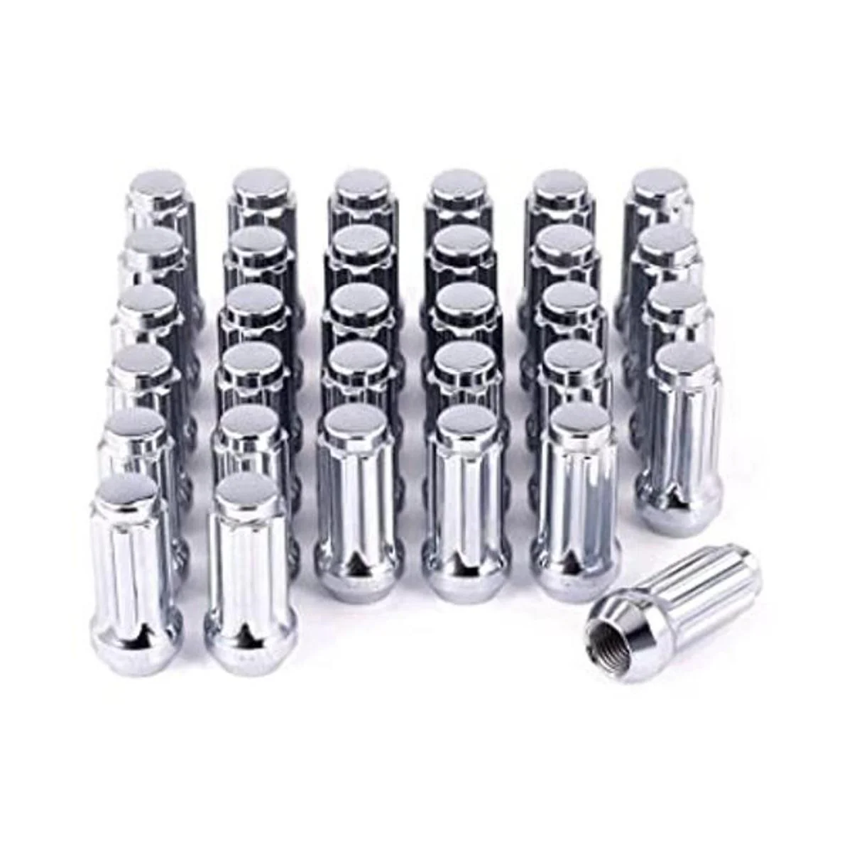 Juego de tuercas todo en uno: incluye todo lo que necesitas para un reemplazo rápido y eficaz de tuercas de llanta en las ruedas de posventa, viene con 32 tuercas cromadas de 14 x 1,5, 1 enchufe de tuercas resistentes 0.827 in y 0.866 in hexagonal