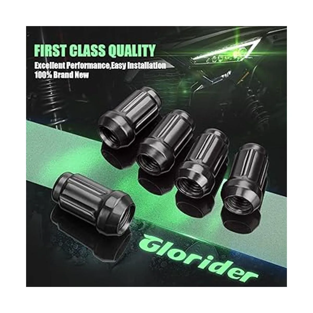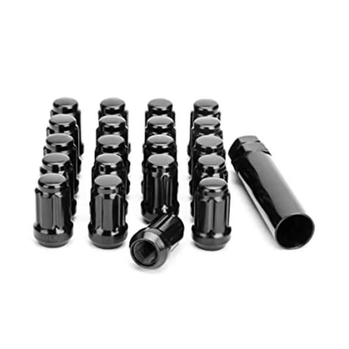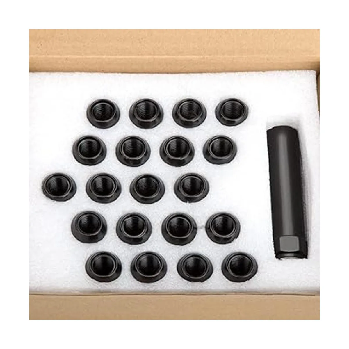 Paquete: 20 tuercas negras de 6 ranuras con 1 llave hexagonal separada y protegida en caja acolchada.