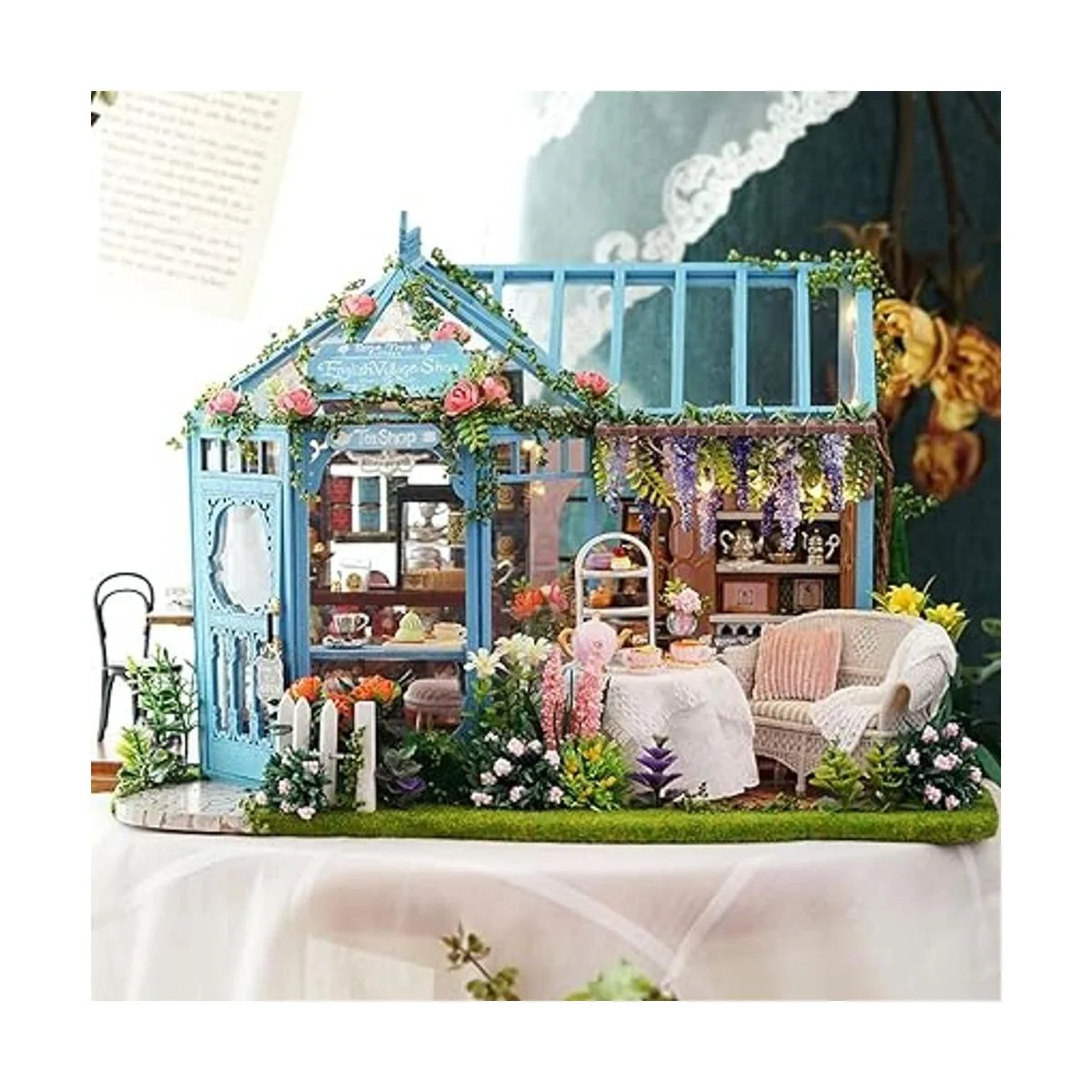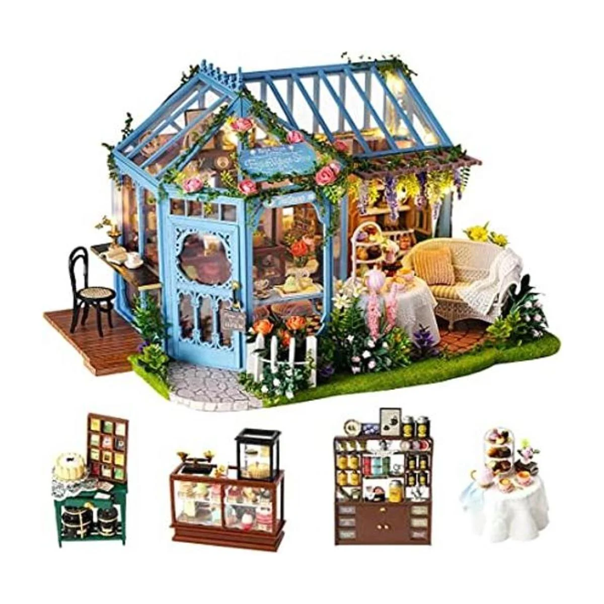 TuKIIE Kit de muebles de casa de muñecas en miniatura, escala 124, accesorios de casa de muñecas de madera, a prueba de polvo y movimiento musical para niños, adolescentes y adultos casa de té de jardín de rosas