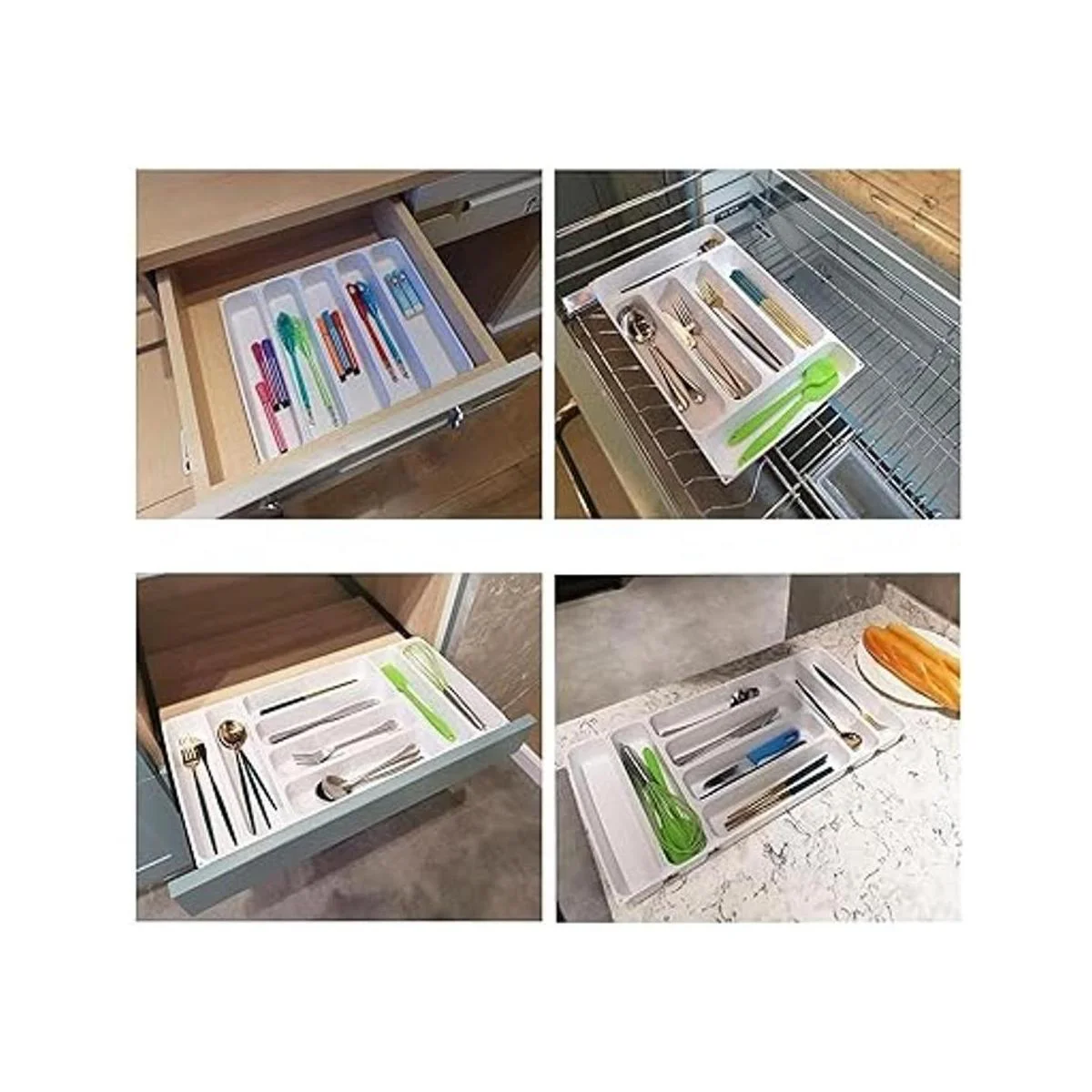 Bandeja expandible de diseño de bricolaje: bandeja organizadora de cubiertos: que se personaliza para adaptarse a tus cajones expandiendo la bandeja para un ajuste perfecto; el organizador de cajones de cocina consta de más piezas de 1, 2, 3, 4, 5 o 6… que se decide por el tamaño de tu cajón o lo que te gusta; los cajones organizadores hacen que sea fácil organizar espacios de cocina pequeños o desordenados y mantener el desorden. Artículos fáciles de recoger; funciona bien en encimera, en armarios, despensa y mucho más
