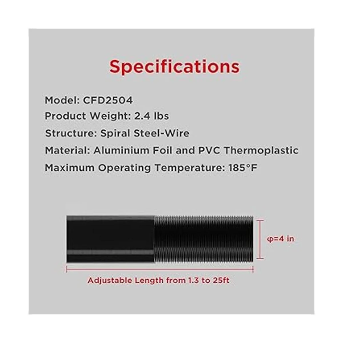 Conducto ideal: esta es una manguera de ventilación de 4 pulgadas de diámetro. Puedes ajustar la longitud de 1.3 a 25 pies para cualquier aplicación HVAC de uso general.