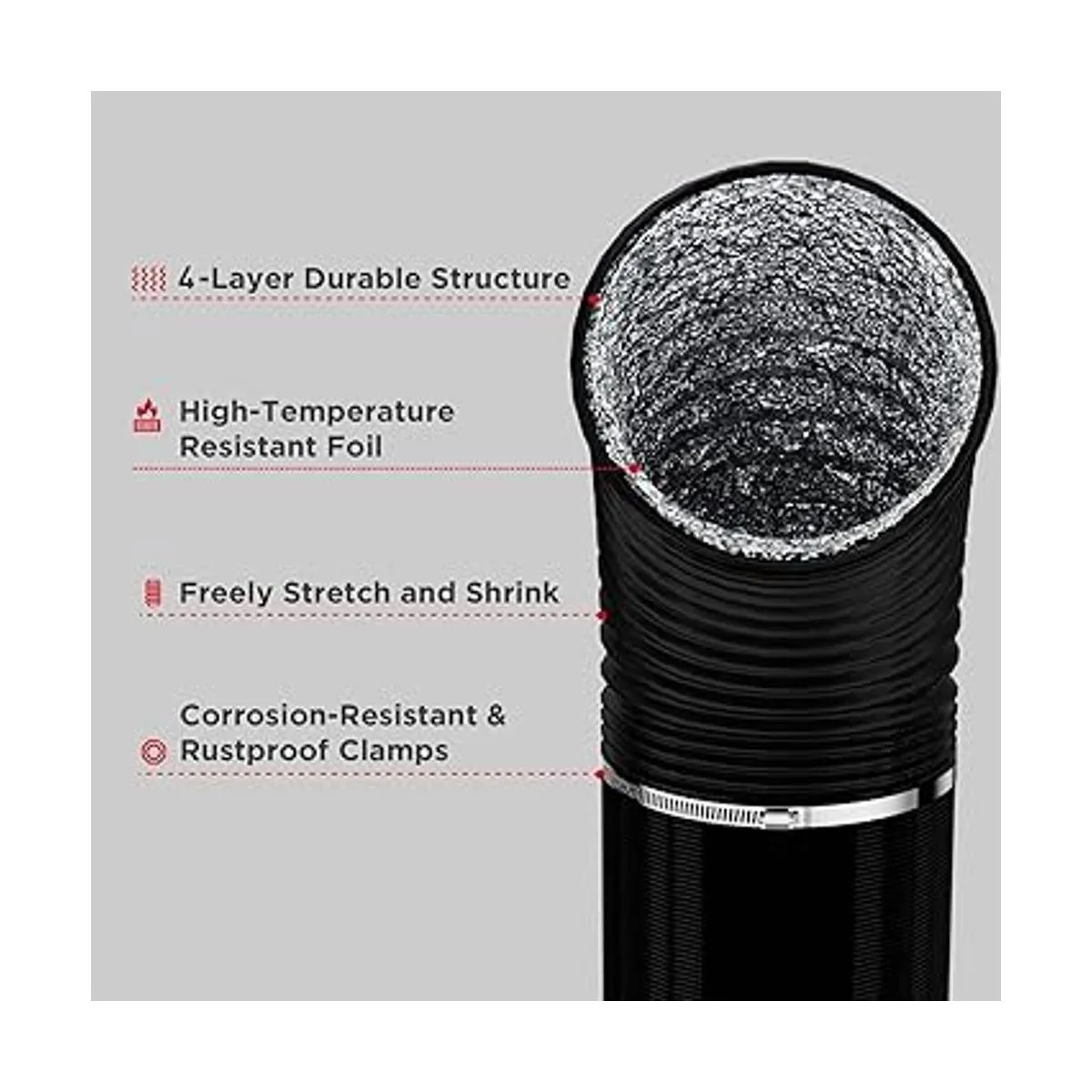 Estructura de 4 capas: nuestra manguera de ventilación está fabricada con lámina de aluminio resistente al fuego de doble capa y termoplástico de PVC de doble capa. Con protección, esta manguera de conducto es extremadamente duradera y no se rompe fácilmente en comparación con un diseño de una sola capa.