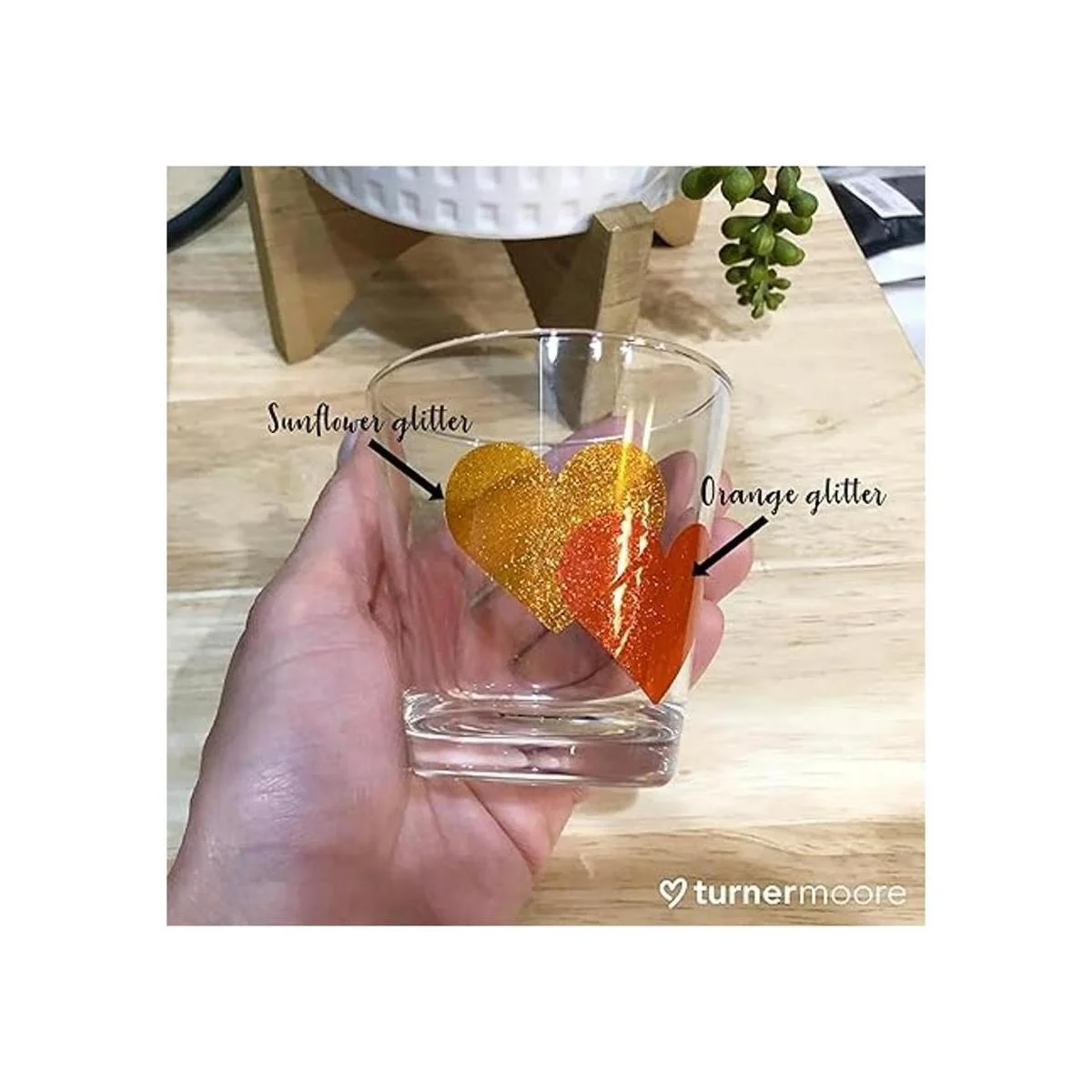 Perfecto para ventanas de coche, cristal, cristalería y vasos, apto para lavavajillas. Nuestro adhesivo de vinilo con purpurina permanente es un producto único en el mercado de vinilos. La purpurina naranja y plateada se muestra en ambos tamaños del vinilo
