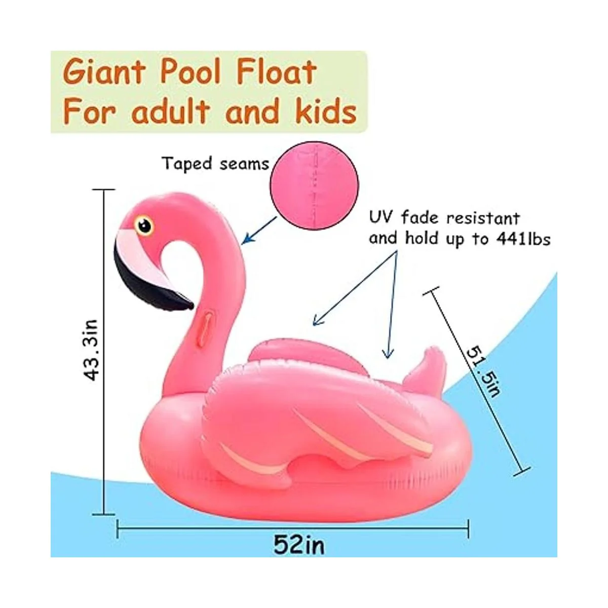 Flotador grande de flamenco rosa para piscina: 52 pulgadas de largo x 51.5 pulgadas de ancho x 43.3 pulgadas de alto cuando está completamente inflado. Soporta hasta 441 libras. Adecuado para niños y niñas a partir de 6 años. Caja de regalo colorida.