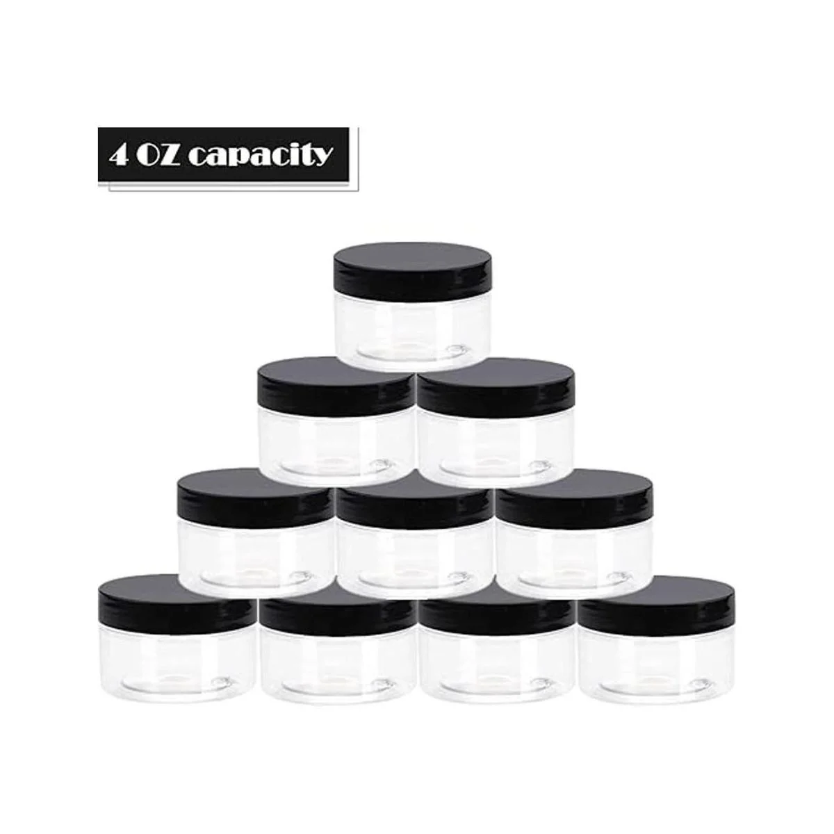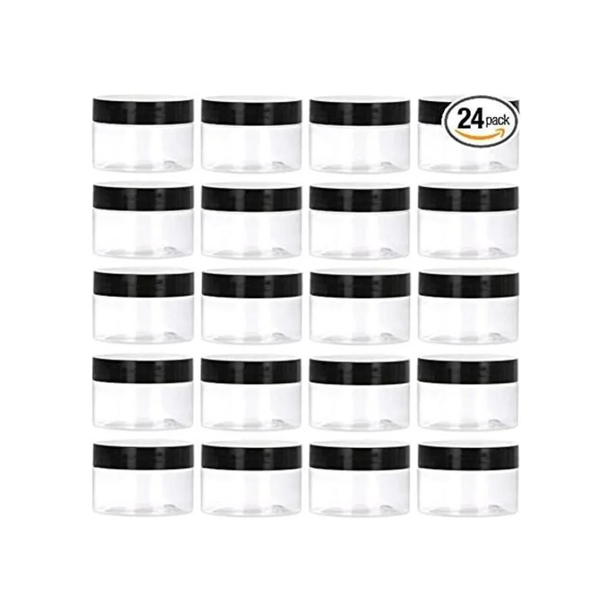 TUZAZO Paquete de 24 tarros de plástico de 4 onzas con tapas y etiquetas libres de BPA, recipientes de plástico redondos y recargables transparentes de 4 onzas con tapas negras para cosméticos, lociones, mantequillas corporales, sal de baño y productos de belleza
