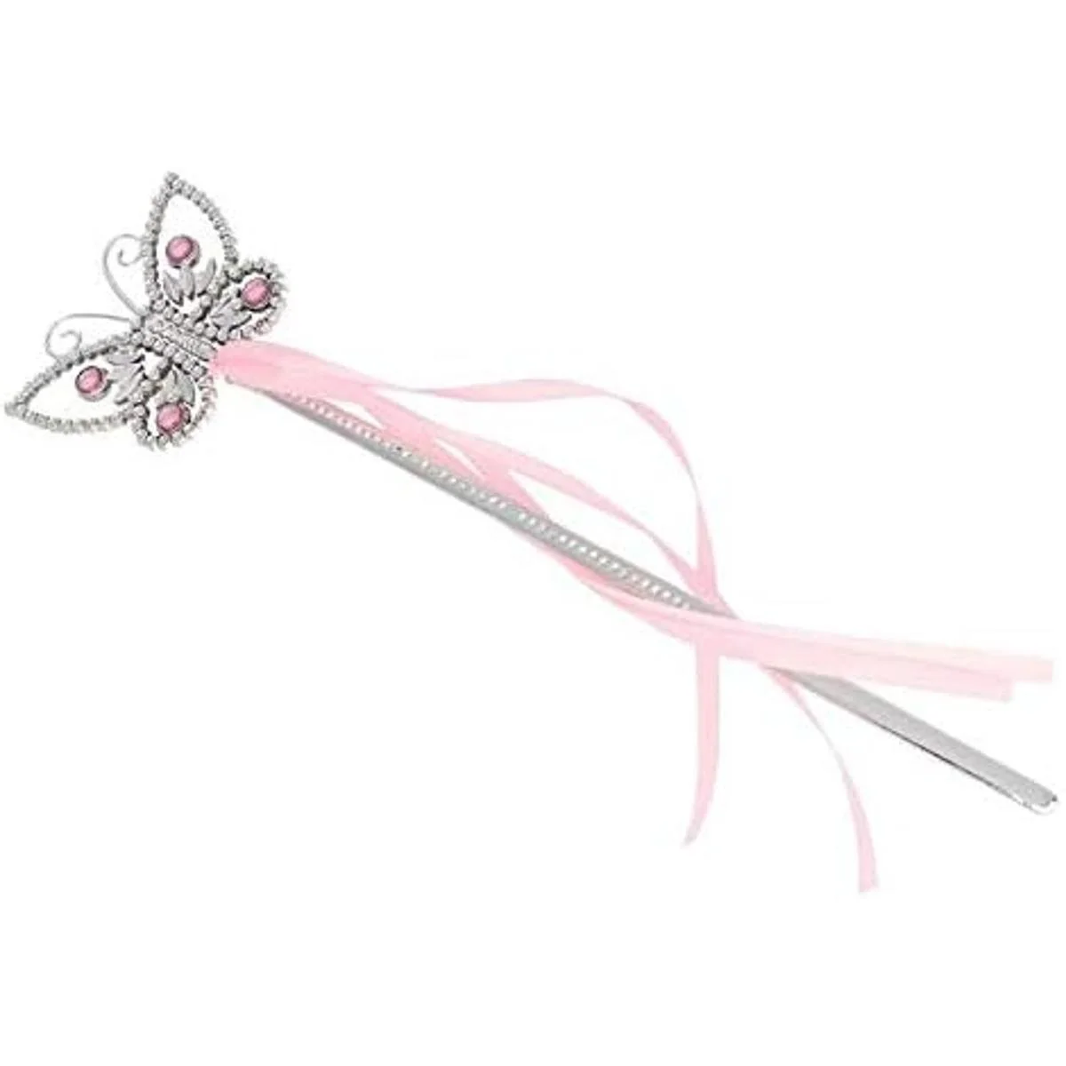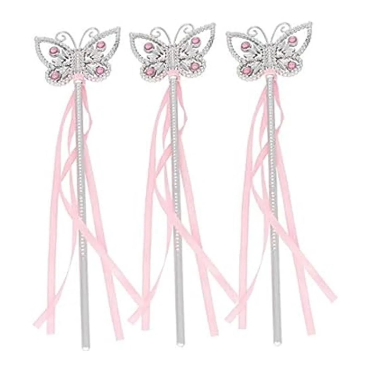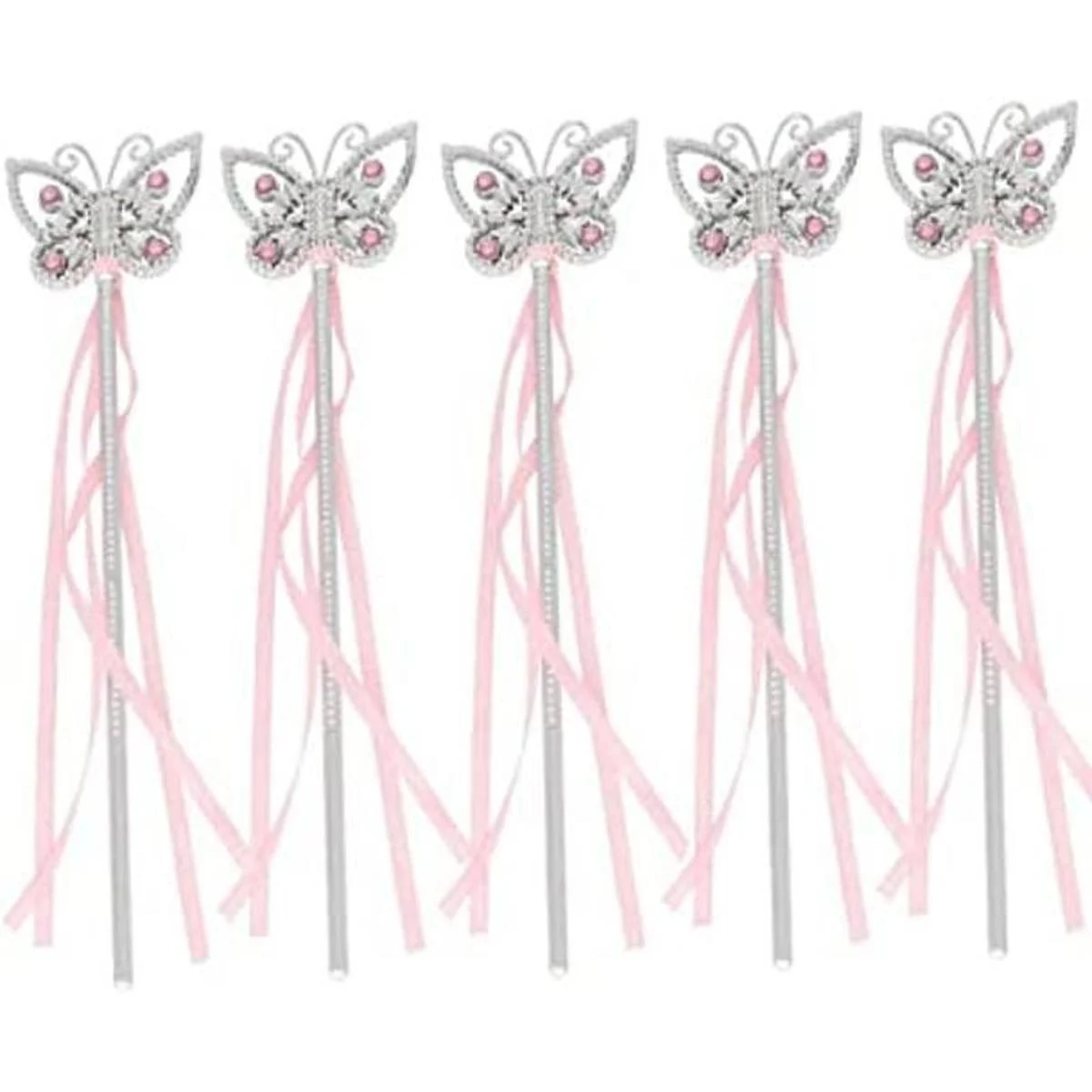 Paquete de 5 varitas de princesa con forma de mariposa. Las varitas son de 13.0 in, con gemas rosas y cinta transparente con purpurina. A partir de 5 años