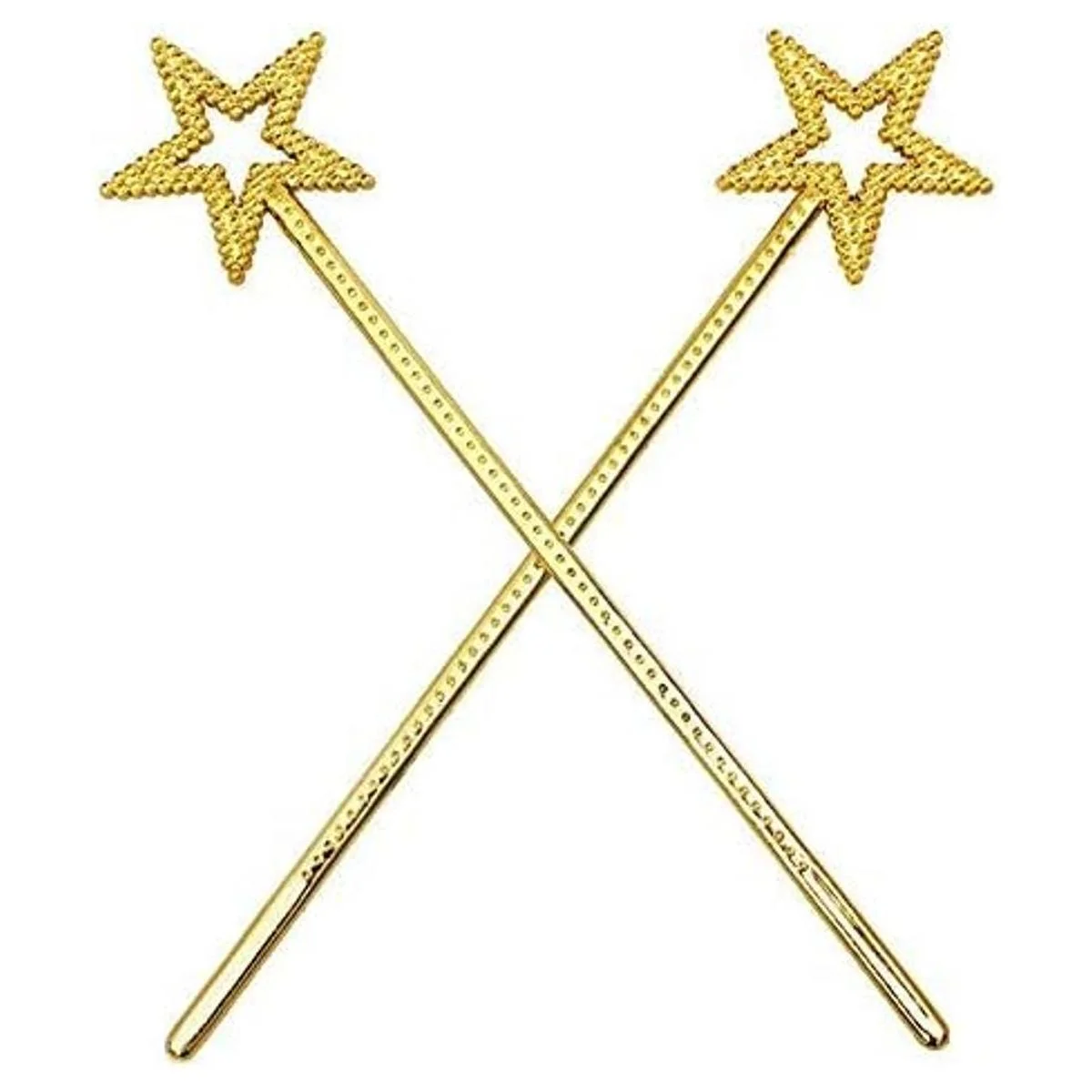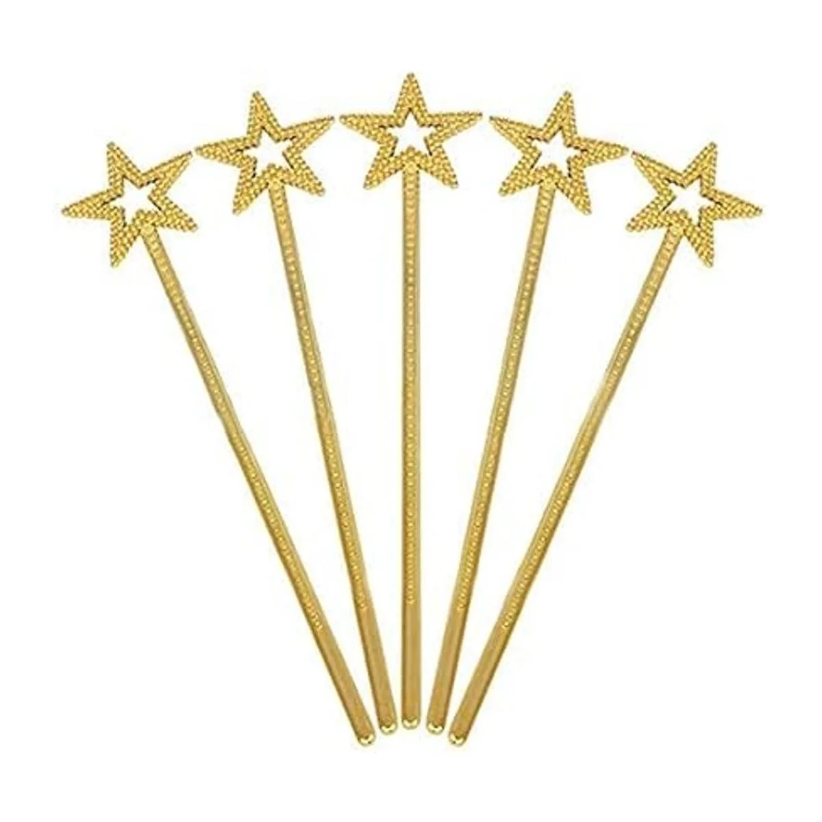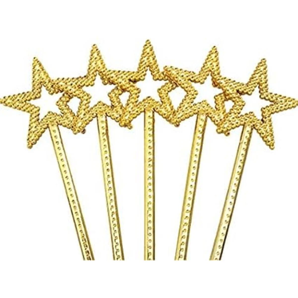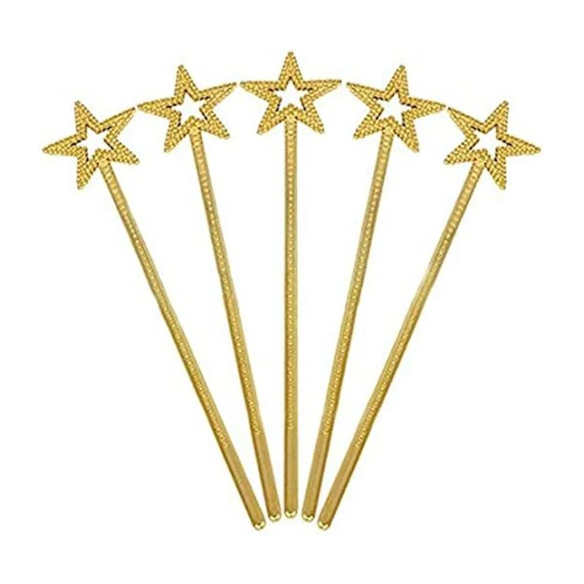 Paquete de 5 varitas de princesa en forma de estrella. Las varitas son de 13 pulgadas, el color es dorado y tiene pequeñas cuentas. A partir de 5 años