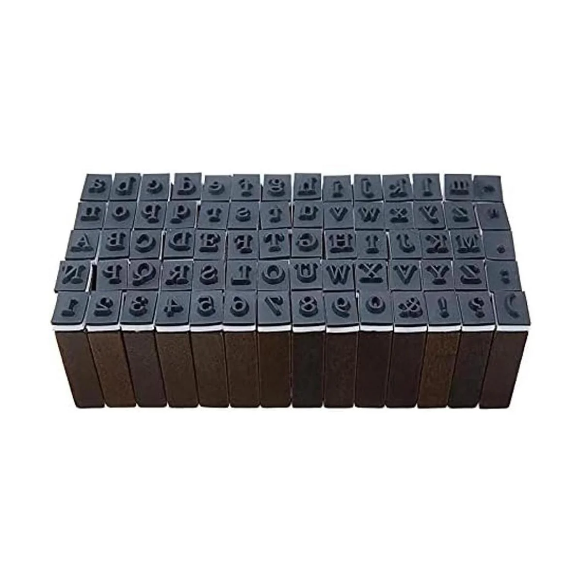 70 sellos del alfabeto de goma: este juego de sellos del alfabeto incluye 26 letras mayúsculas, 26 letras minúsculas, 10 números 0 9 y 8 signos de puntuación un período, un signo de interrogación, un signo de exclamación, marcas de cita, un guifen, paréntesis, colon y una marca de ampersand.