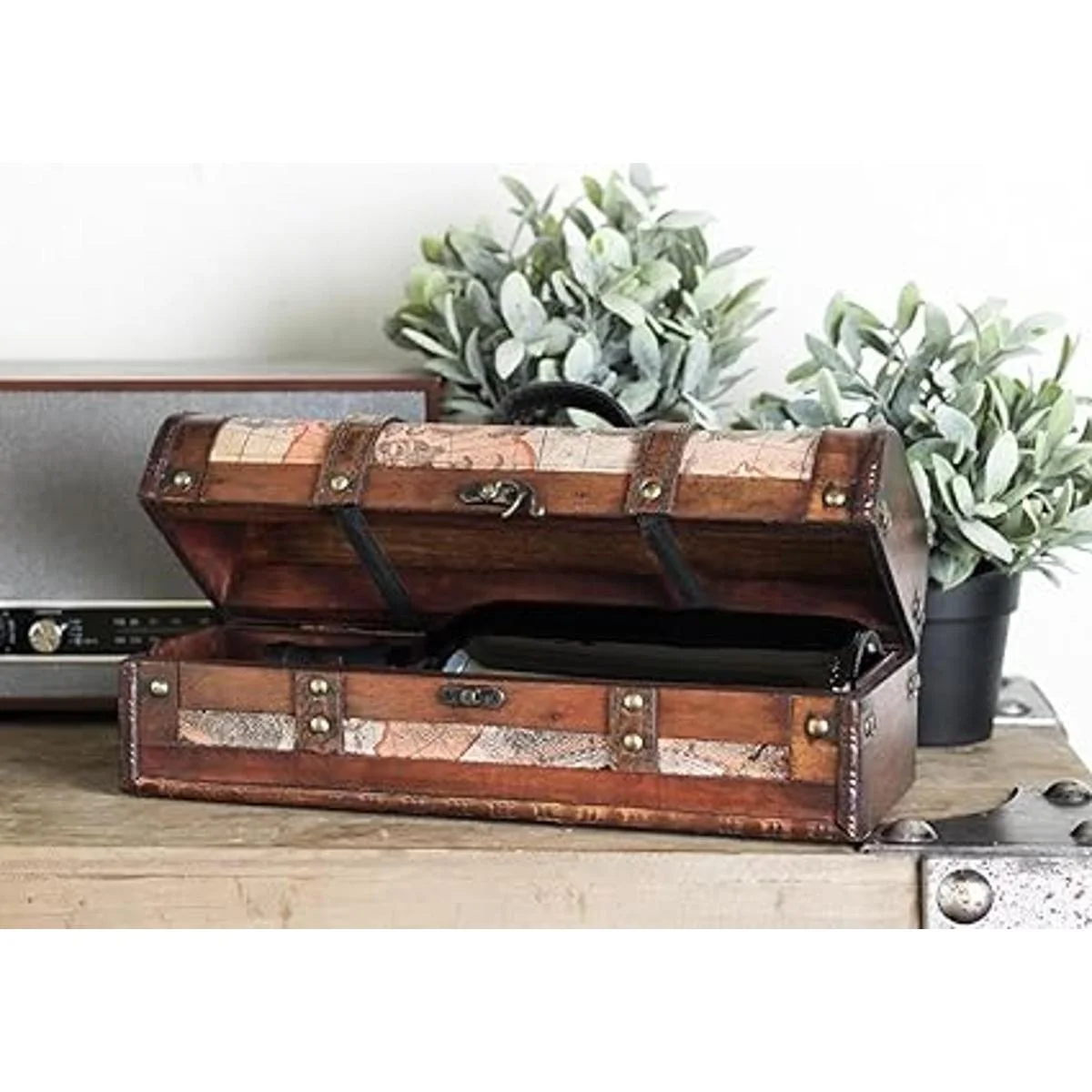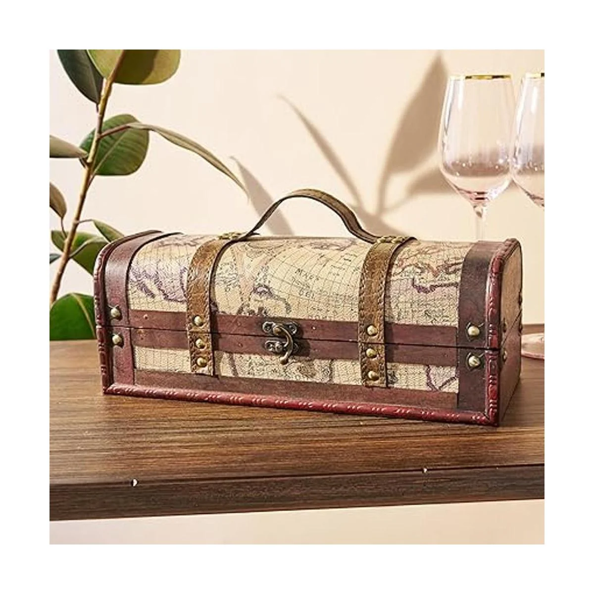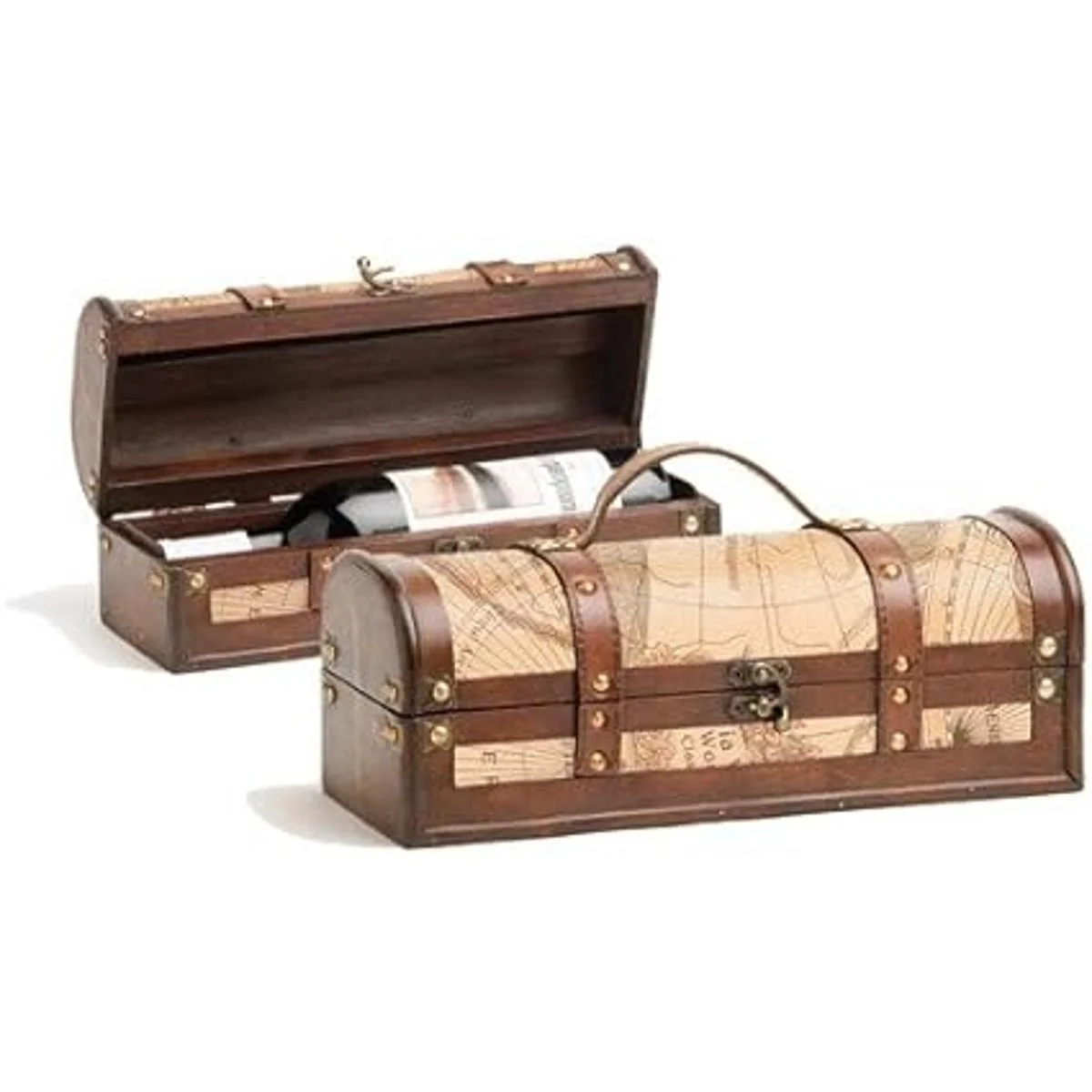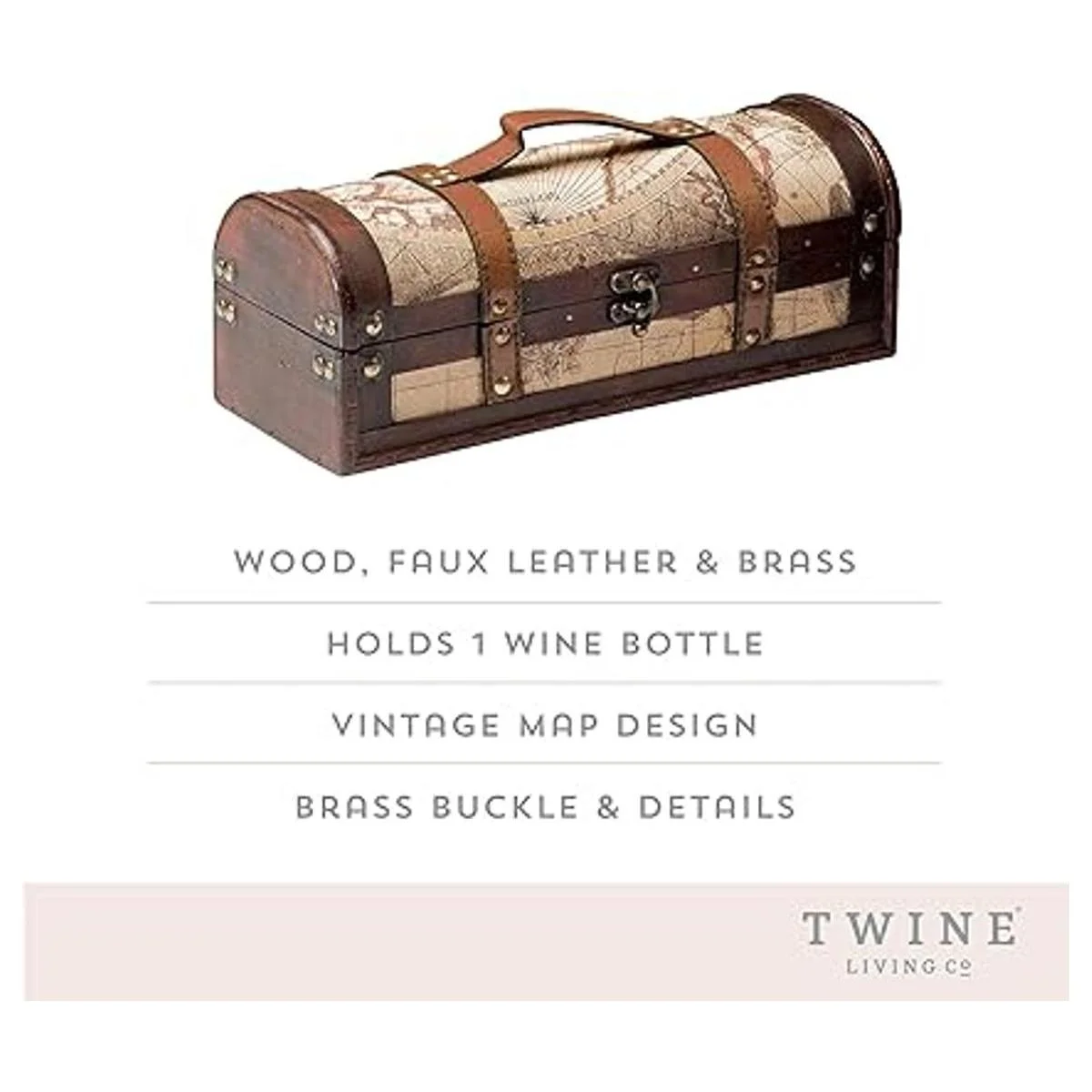 Twine Old World Caja de regalo para botella de vino, caja de vino de madera con tapa y asa, capacidad para 1 botella, madera, piel sintética, diseño de mapa antiguo