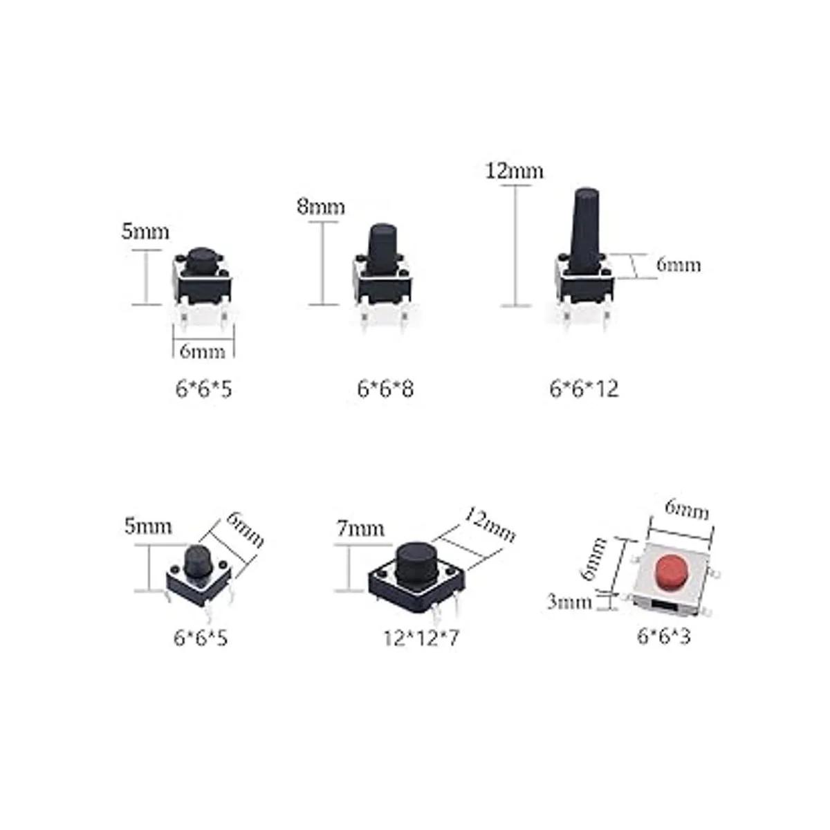 Tamaños del interruptor: 26 tipos, 0.118 x 0.236 x 0.098 in, 6 x 6 x 3/5/5/5/0.472 in, 3 x 4 x 2,5/0.197 in, 0.098 x 0.177 x 0.138 in, 0.157 x 0.157 x 0.059 in, 0.118 x 0.138 in, 0.177 in, 0.177 in 5 x 4.5 3,3/4/0.197 in, 12 x 12 x 4,5/7/0.276 in, 0.118 x 0.236 x 0.197 in, 0.138 x 0.236 x 0.157 in. La altura de la dimensión no incluye la altura del pin.