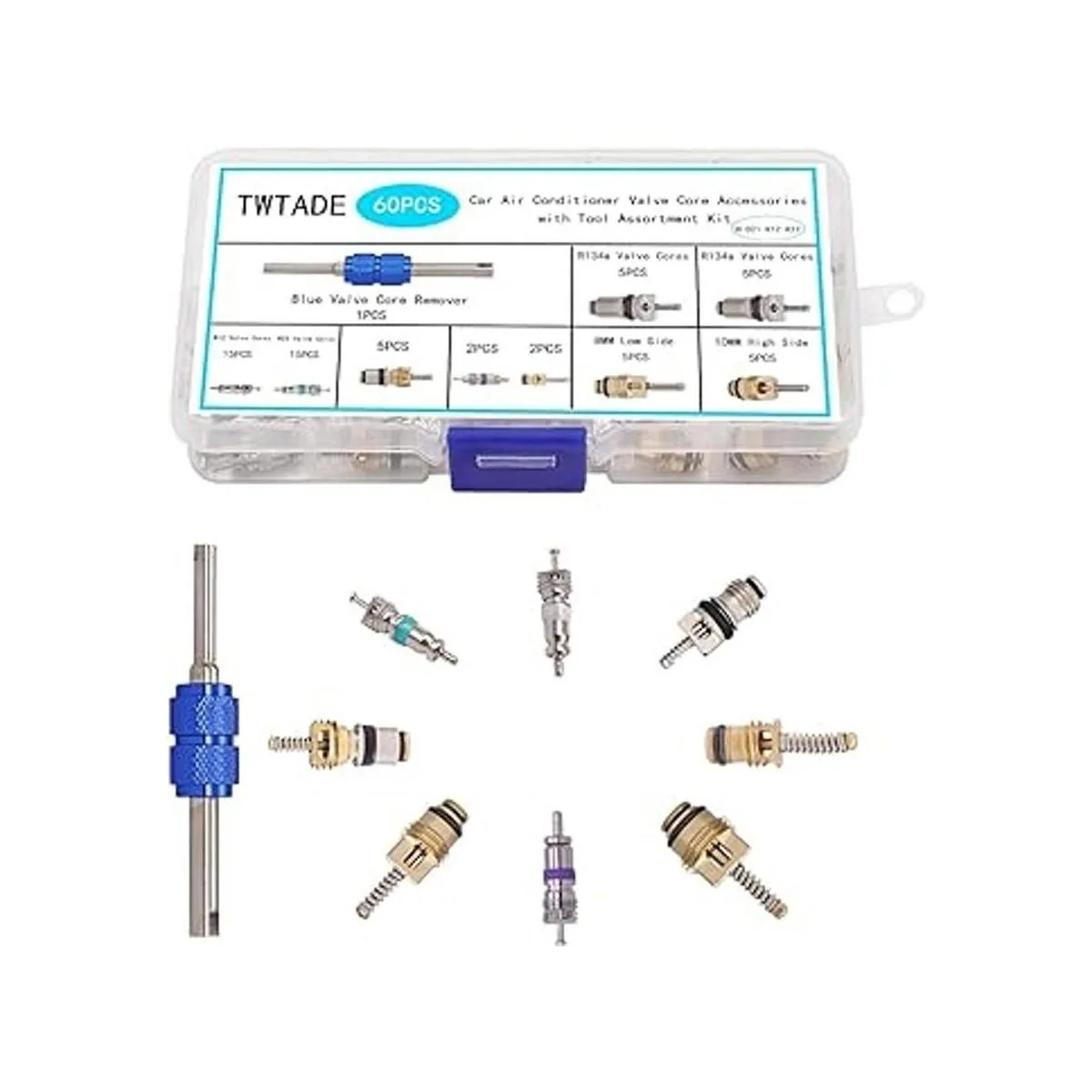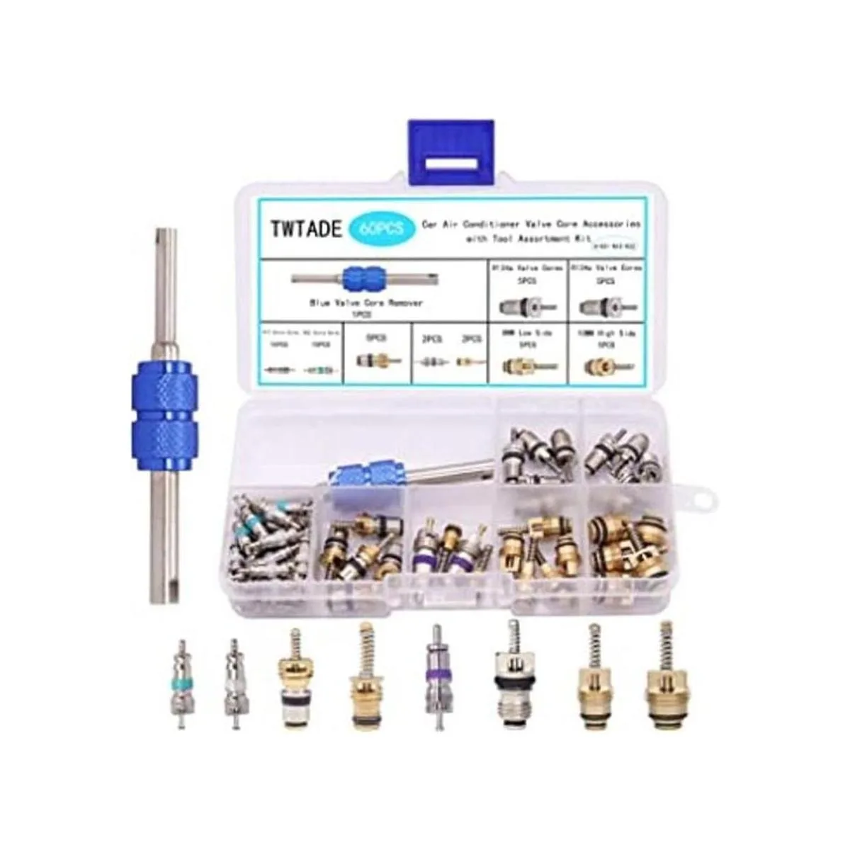TWTADE 60 piezas de aire acondicionado para válvulas de automóvil, accesorios de núcleo con herramientas de extracción, kit surtido R12 R134a para válvulas de neumáticos, kit de reparación de núcleos H021R12
