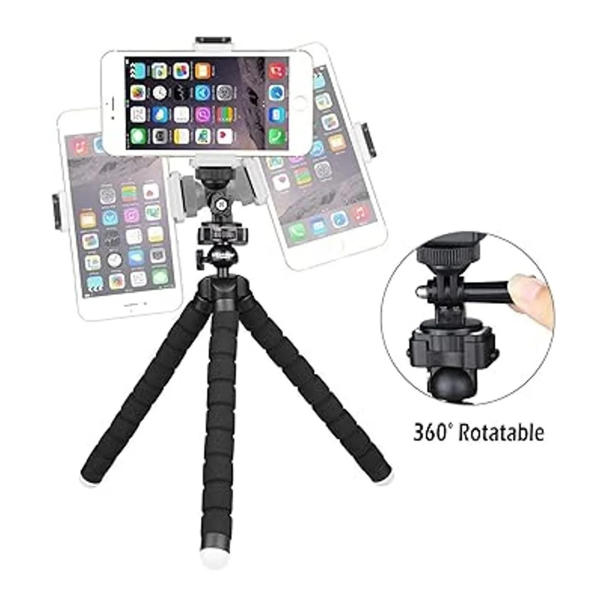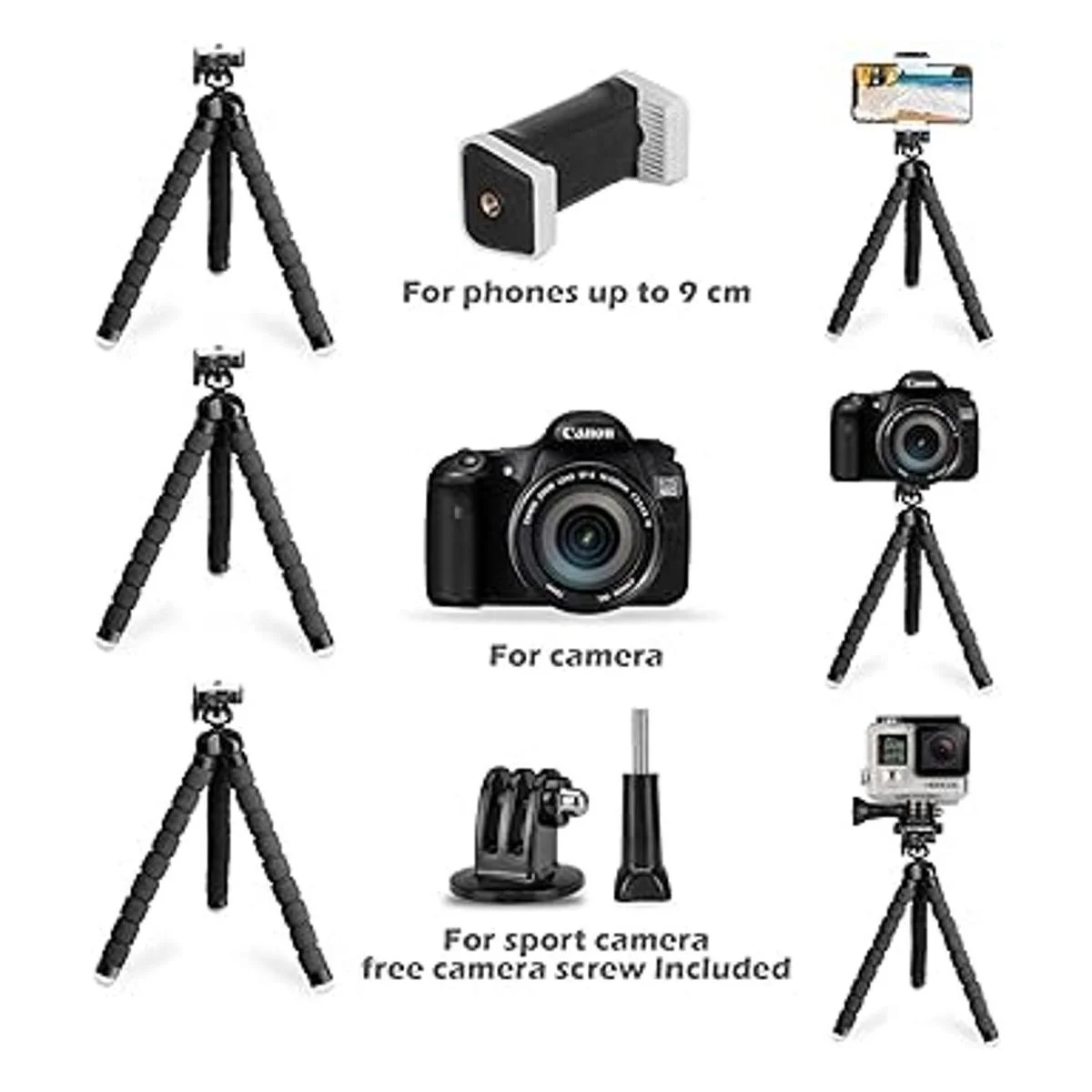 Mayor estabilidad Una junta de metal de alta calidad soporta el teléfono/cámara de hasta 2.2 libras/1 kg, bloquea el smartphone más pesado en posición de forma segura. Diseño de pies antideslizantes que mantiene este trípode ajustable estable en la superficie del suelo virtual.