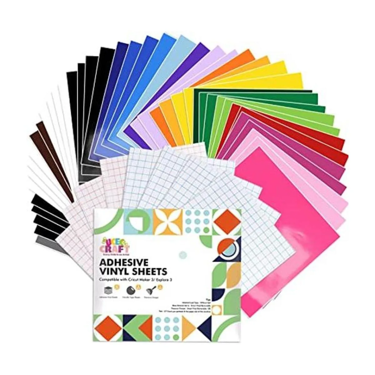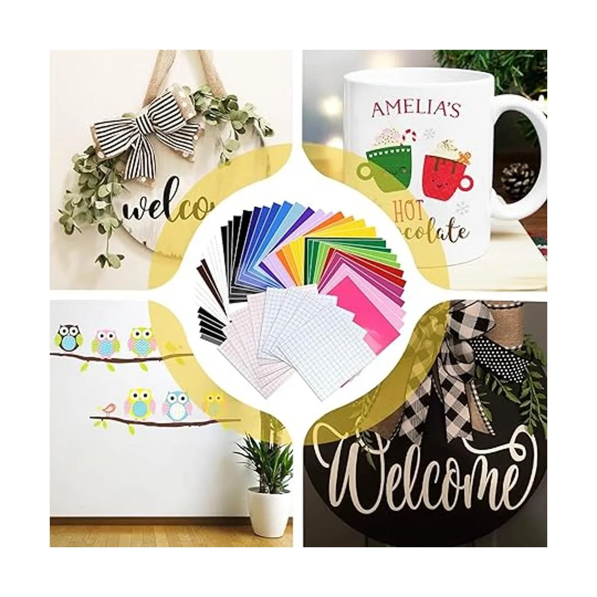 UCEC Hojas de vinilo extraíbles compatibles con Cricut Maker 3Explore 3, 13 pulgadas x 12 pulgadas, 43 hojas de vinilo autoadhesivas y 8 hojas de cinta de transferencia y 1 raspador premium, para decoración de botellas de vasos de álbumes de recortes