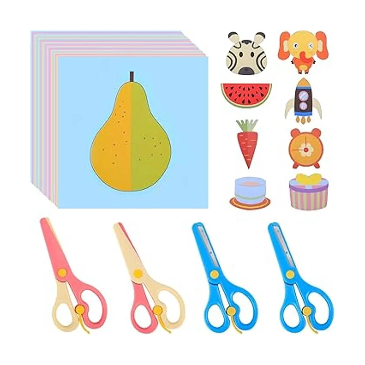 Juego de tijeras de práctica para niños: paquete de 2 tijeras para niños con hoja de acero inoxidable, 2 tijeras de seguridad de plástico y 100 piezas de papel de corte con diferentes patrones. Mejora las habilidades de los niños practican tijeras. Estas pequeñas tijeras para niños de la escuela ayudan en el desarrollo de habilidades motoras finas y habilidades cognitivas.