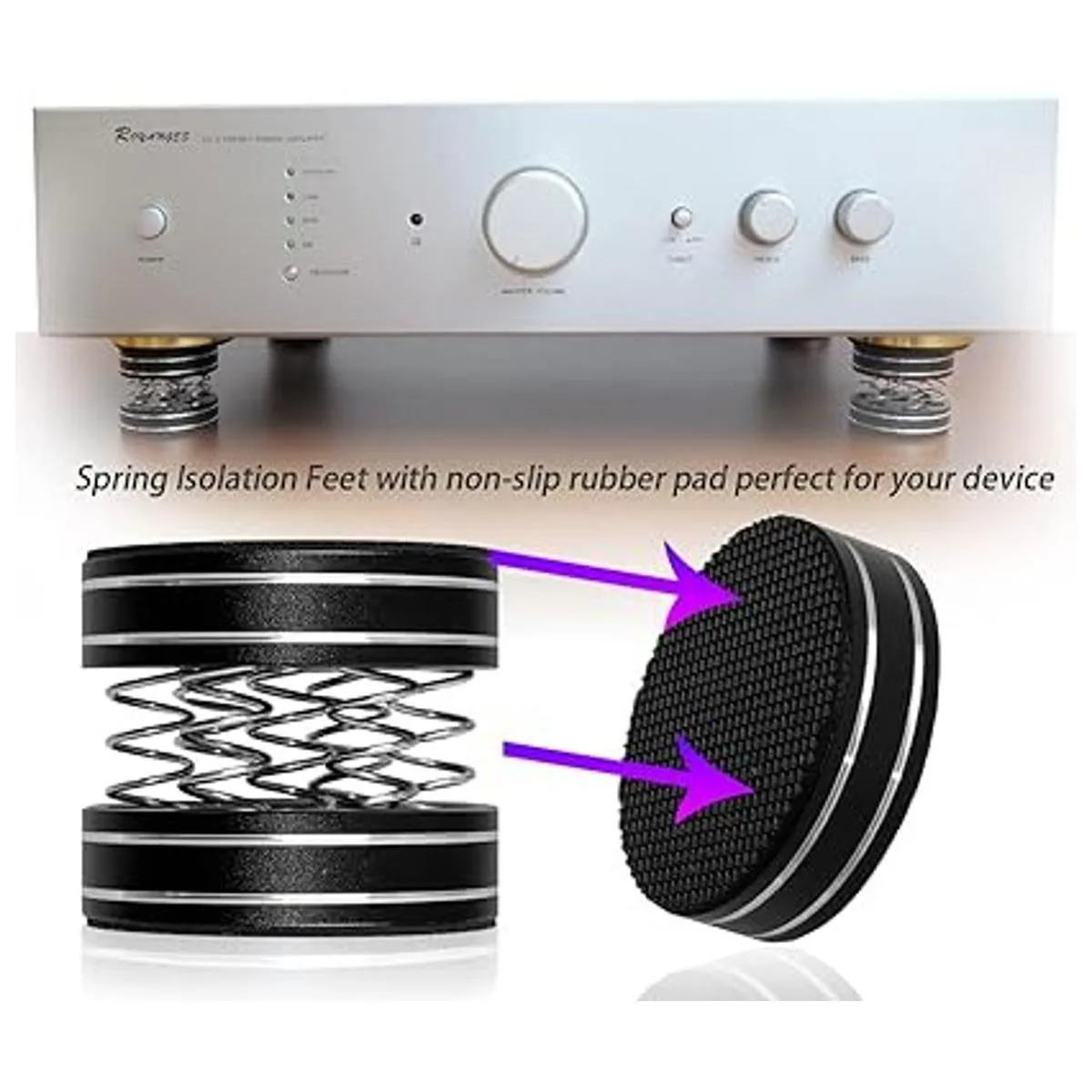 Fácil de instalar: viene con 4 soportes de aislamiento montados para altavoces. La capacidad de carga de cada pie puede hasta 17.5 libras. Un juego para 4 piezas puede soportar hasta 66 libras. Es tan fácil y conveniente para que puedas ajustar el rodamiento de carga quitando o añadiendo resortes para ayudar a que el sonido se sienta bien. Mejorará la claridad del sonido en la música. Ayuda a evitar que el tocadiscos salte. La mejor solución de mejora de sonido para Audiófilo.