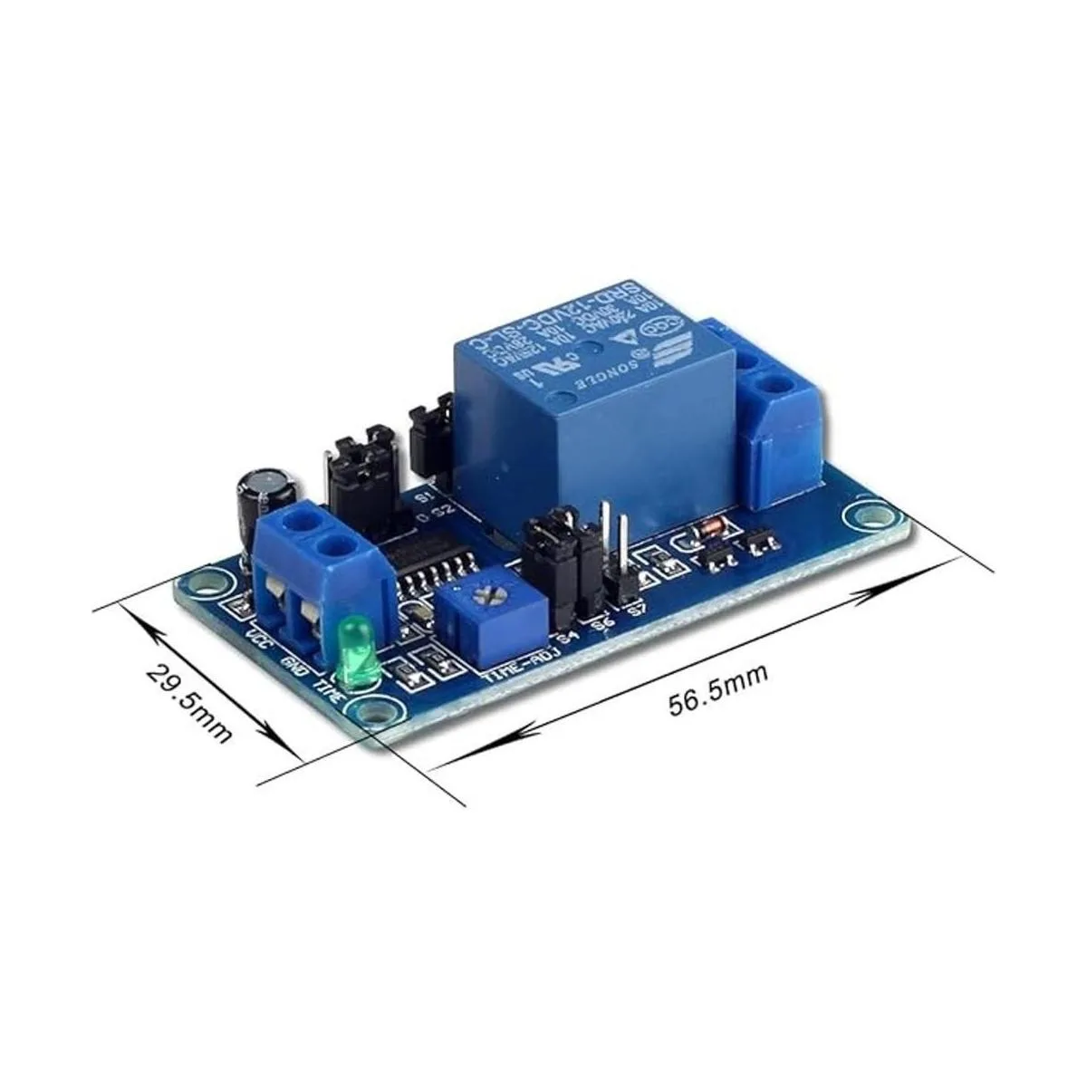 Funciones: soporta los modos de retardo y apagado, el tiempo de retardo se puede ajustar de 0,1 s a 1 h, el modo de retardo y el tiempo de retardo se puede ajustar cortando o abriendo los pines del puente y girando el potenciómetro.