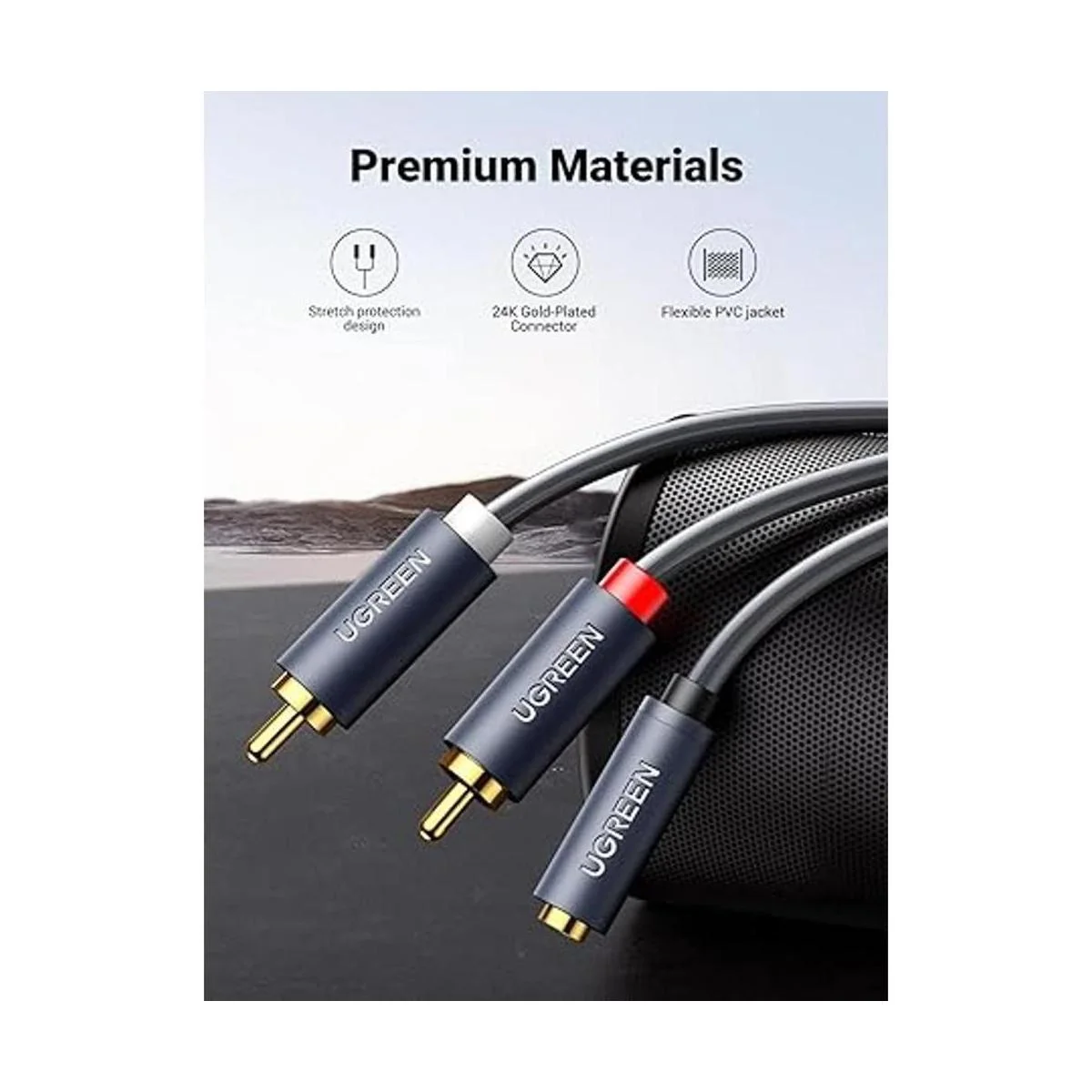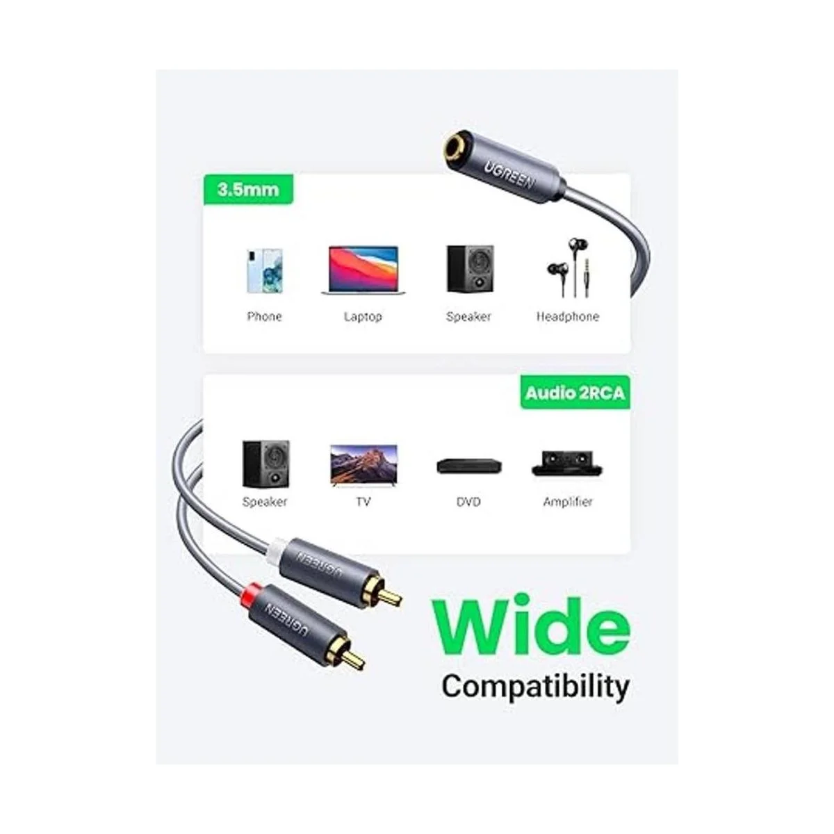Cable de audio hembra de 0.138 in a 2 RCA: UGREEN de 0.138 in a doble RCA macho transmite audio estéreo HiFi desde dispositivos de puerto auxiliar a dispositivos de puerto rojo y blanco L/R con un cable macho a macho adicional de 0.138 in, como conectar portátil al amplificador, TV a barra de sonido, reproductor de DVD a altavoz, DAC a tocadiscos. El cable hembra auxiliar de 1/8 a rojo y blanco te ofrecería una experiencia de sonido estéreo notable.
