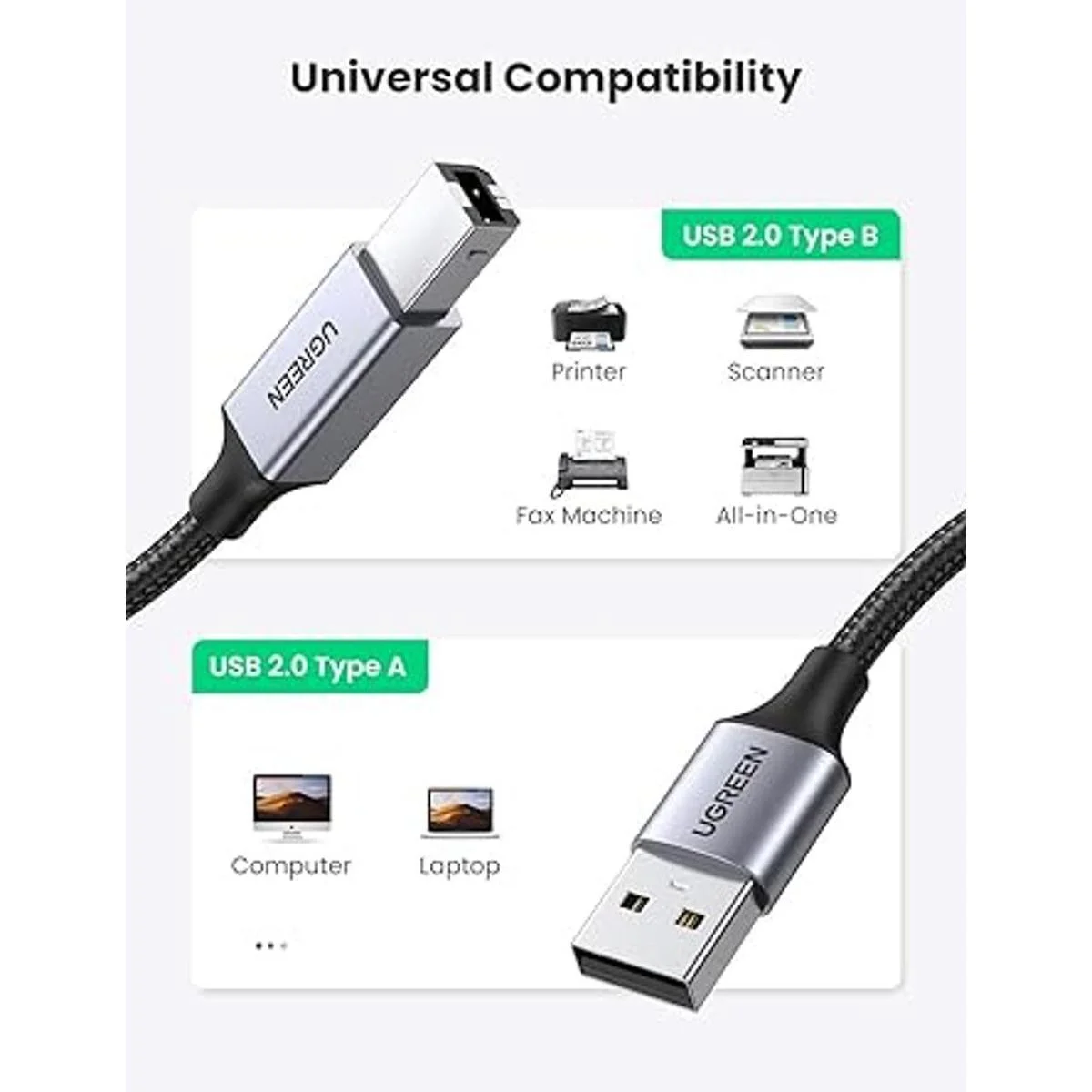 Compatibilidad universal: el cable USB B UGREEN es ideal para conectar tu impresora, escáner, servidor, cámaras como Epson, Canon, HP, Samsung, Dell, Lexmark, Xerox y otros dispositivos USB B a un portátil, computadora Mac/PC u otro dispositivo habilitado para USB.