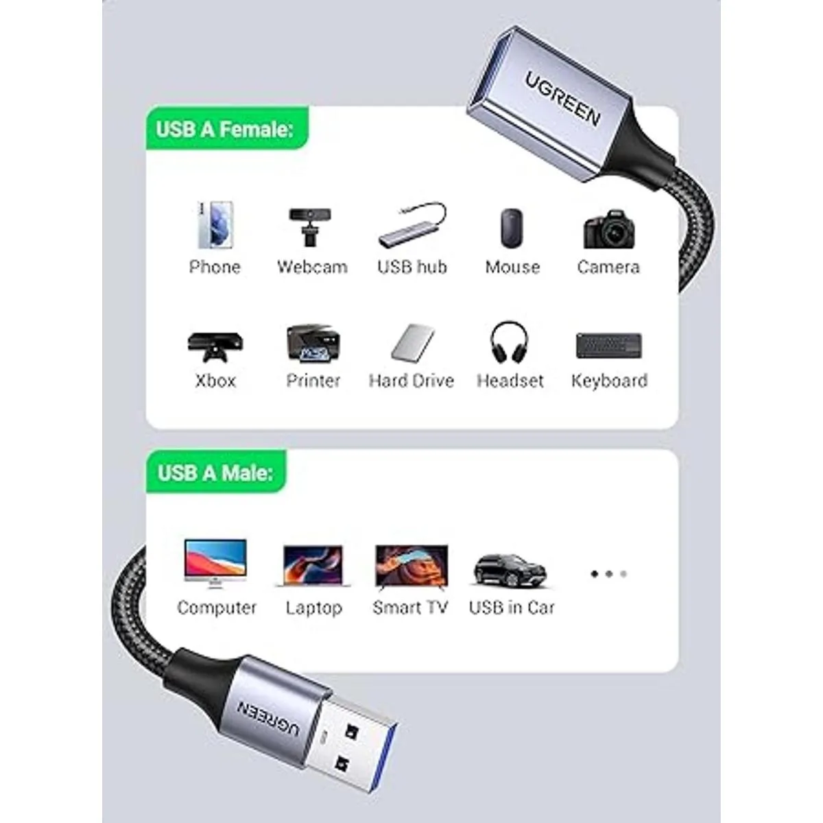 UGREEN Paquete de 2 cables de extensión USB, 10 pies 10 pies extensor USB 3.0 cable de extensión de nailon trenzado compatible con cámara web, cámara, teléfono, concentrador USB, mouse, teclado, impresora, disco duro, auriculares