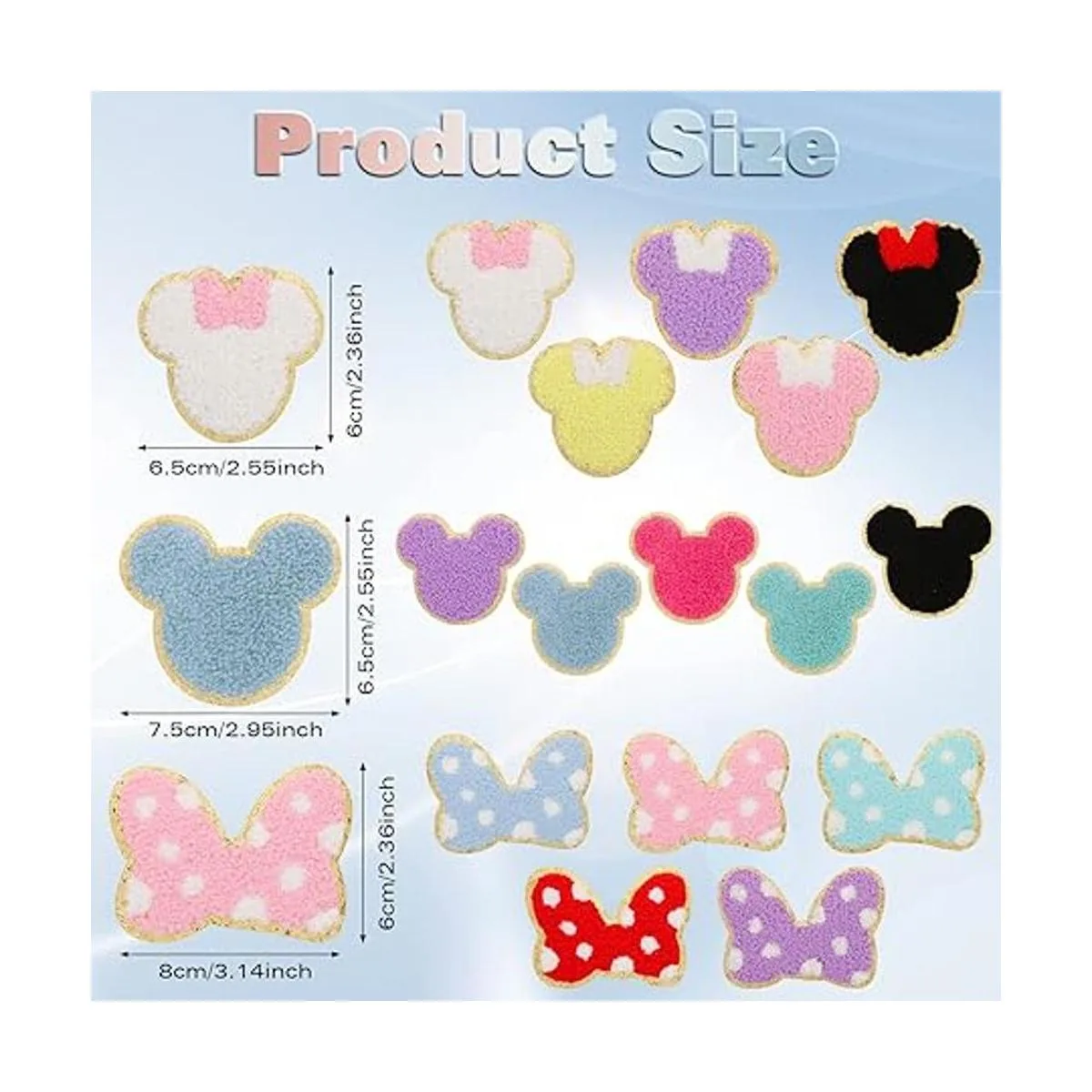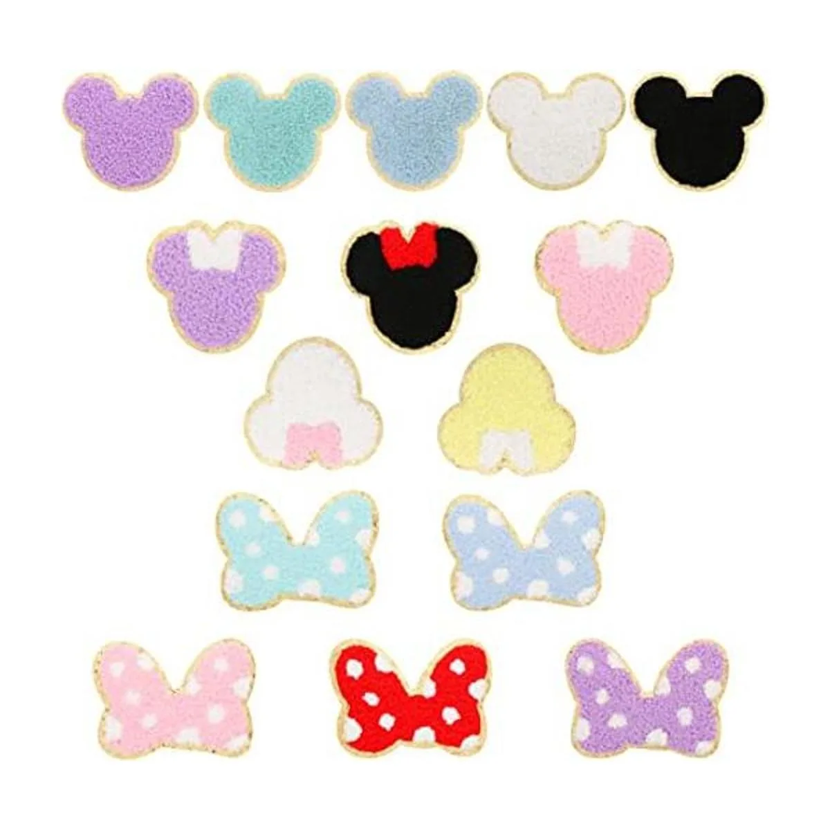 UHOMENY Juego de 15 parches coloridos de felpilla para planchar con lazo, bonito parche bordado con cabeza de ratón, parches bordados para coser, parches bordados con ribete dorado, parches de mariposa termoadhesivos para ropa, bricolaje