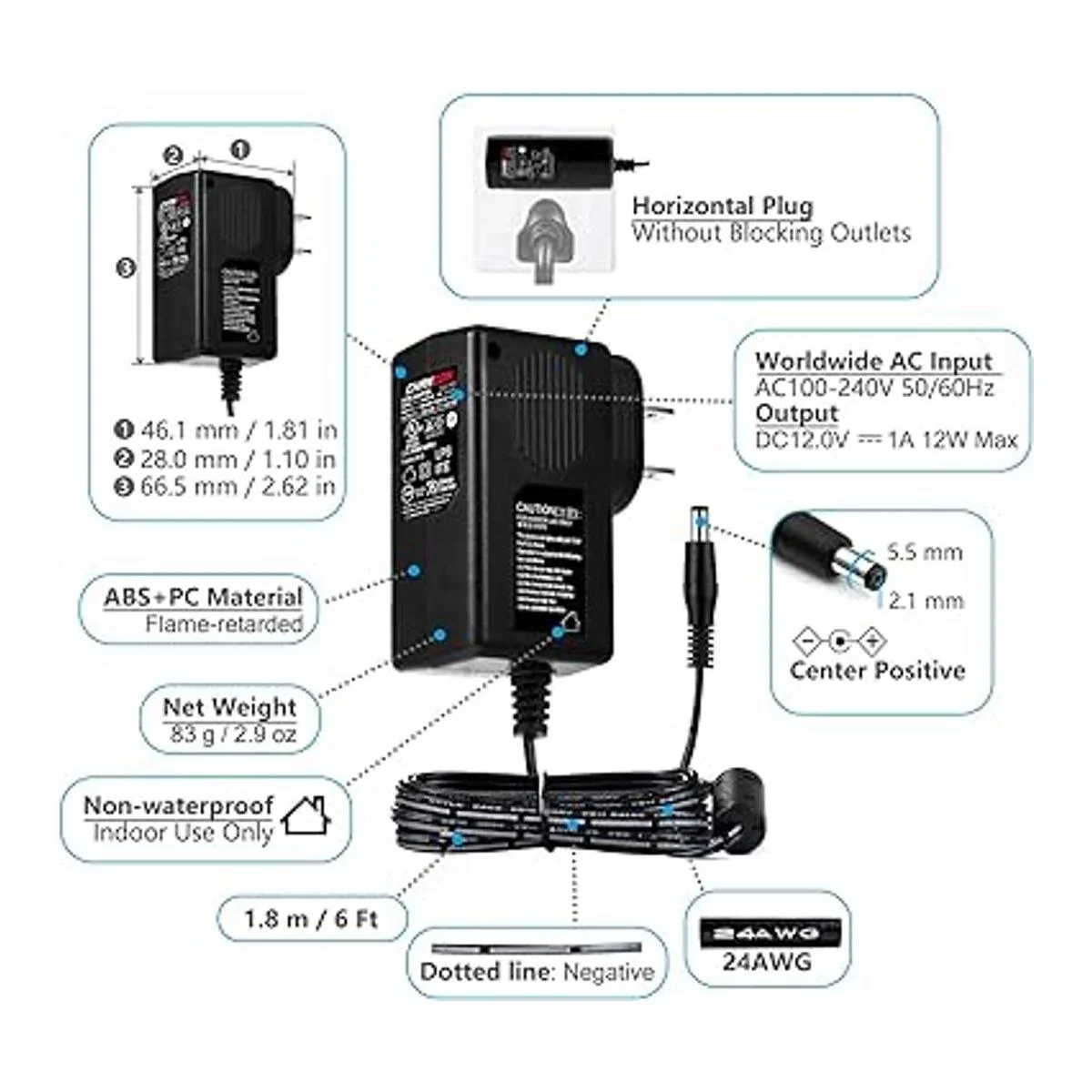 general: solo para enchufe central positivo de 0.083 in x 0.217 in, entrada CA 100 V240 V 50/60 Hz, 12 V CC 01000 mA 12 W de salida, cable de alimentación de 5.9 ft