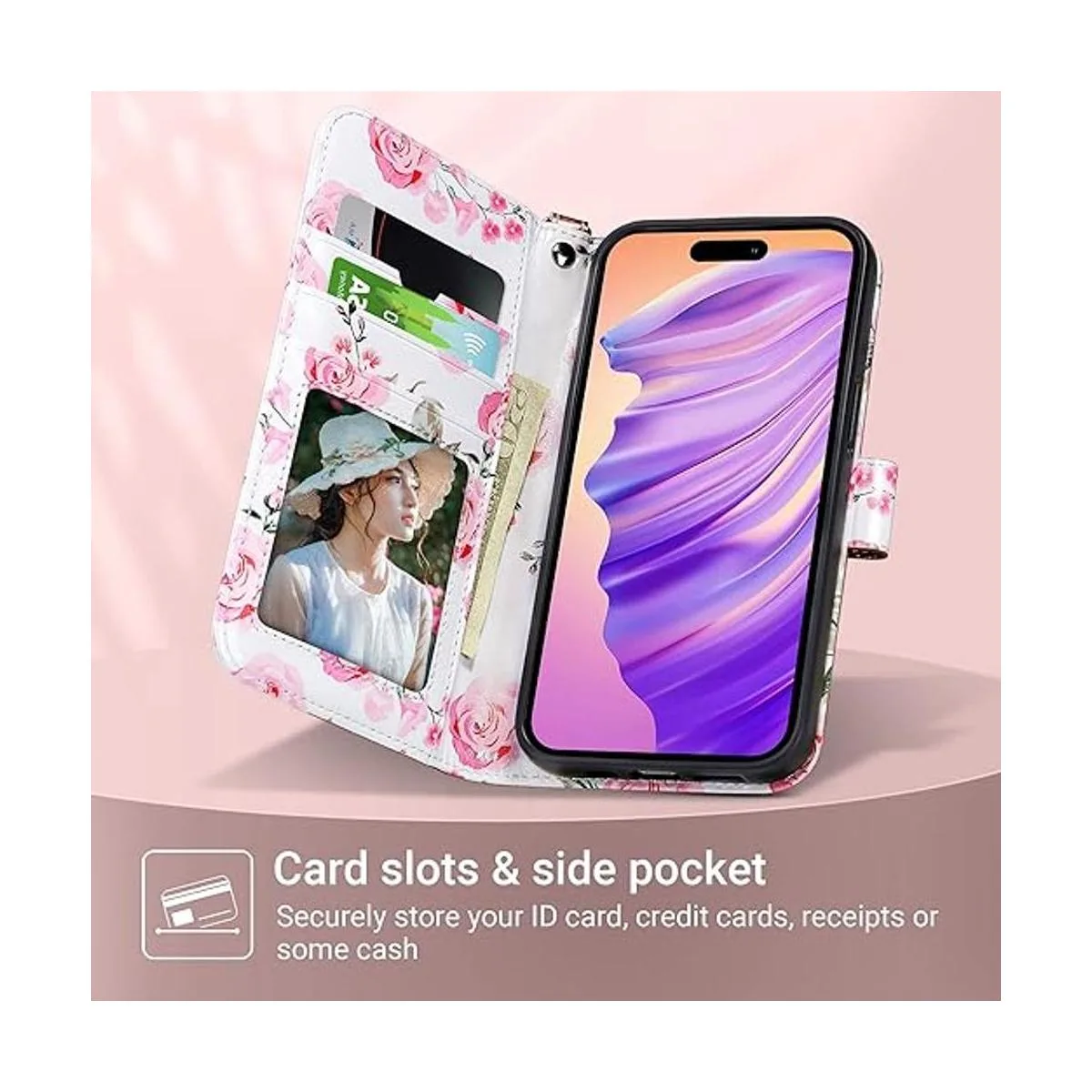 Prácticos tarjeteros: funda tipo cartera para iPhone 14Pro con 3 ranuras para tarjetas y 1 bolsillo lateral, almacena cómodamente tu identificación, licencia, foto, dinero en efectivo y tarjetas de crédito, sin llevar el bolso al aire libre