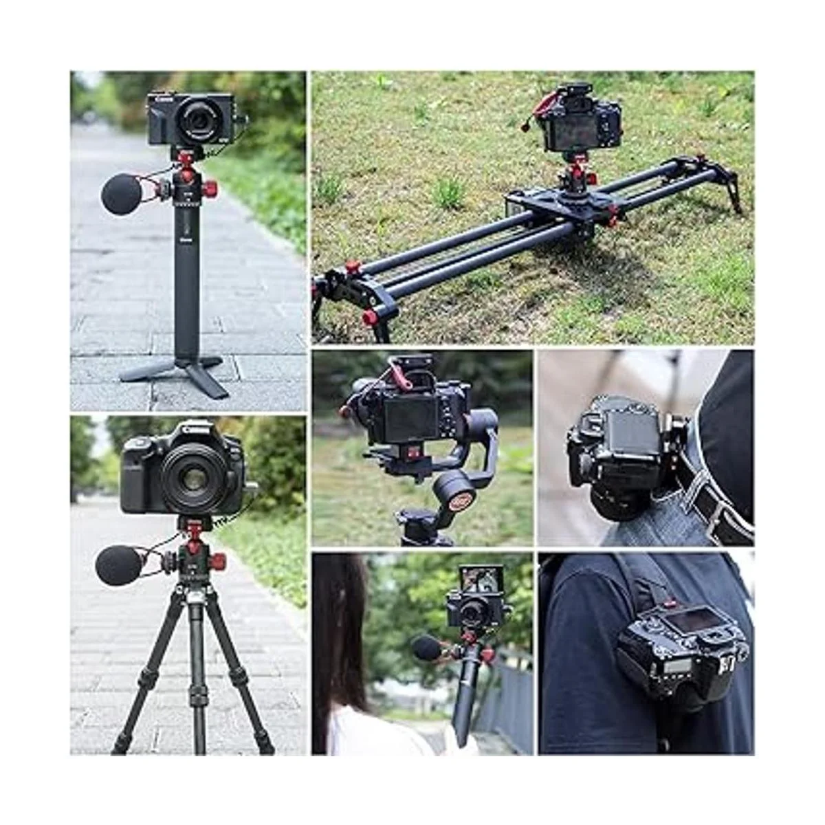 Adaptador de tornillo de 1/4 a 3/8 y una rosca de tornillo inferior de 3/8 pulgadas. Puedes fijarlo a tu trípode, monopie o deslizador de cámara para añadir más flexibilidad en el cambio de ángulo.