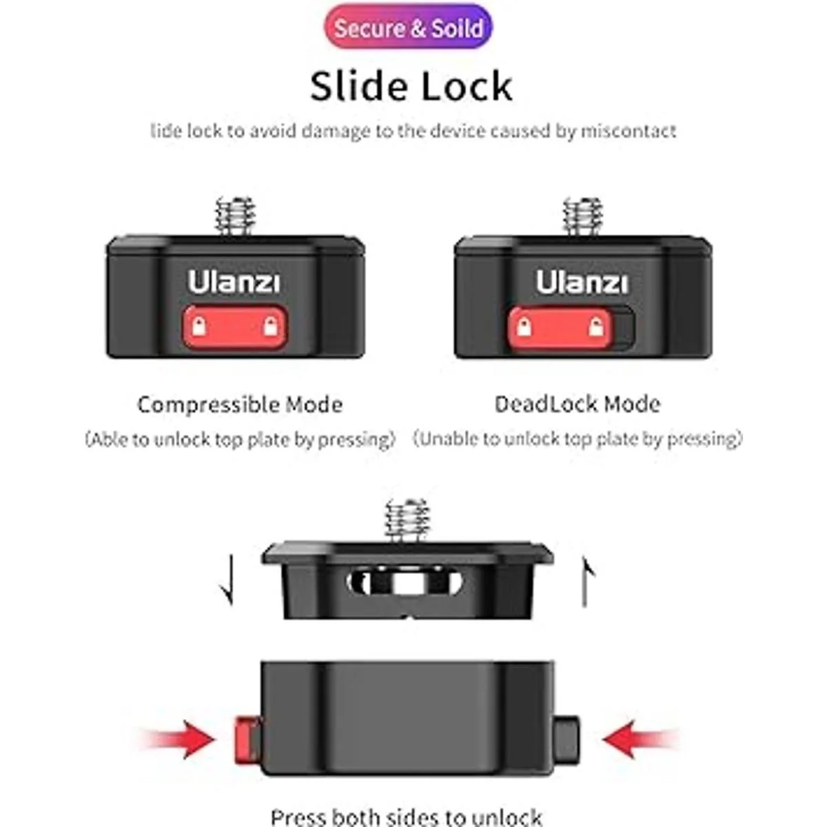 Diseño de configuración y liberación súper rápida: La placa de liberación rápida creada originalmente por ULANZI le permite soltar y configurar entre cámara / teléfono inteligente / trípode / monopié / estabilizador / control deslizante rápidamente en lugar de atornillar. La placa QR te permite cambiar entre el modo vertical y el modo suspendido en un segundo.